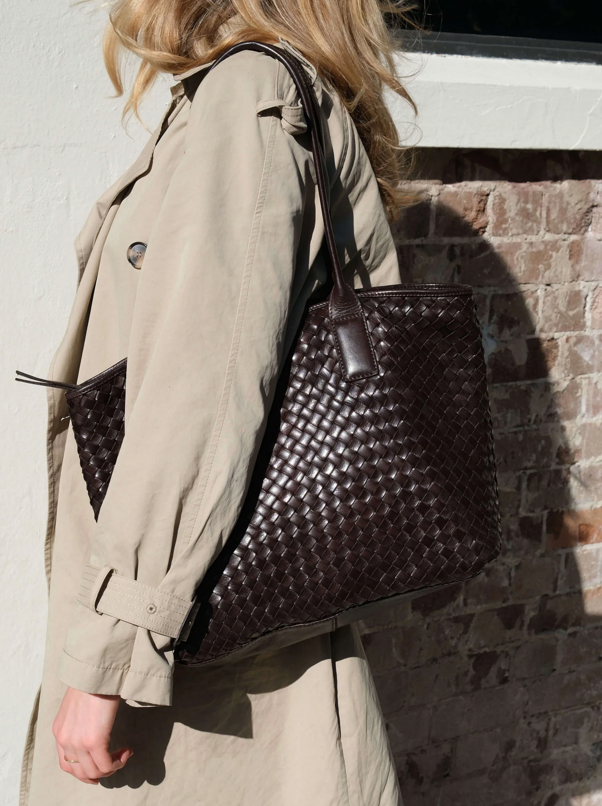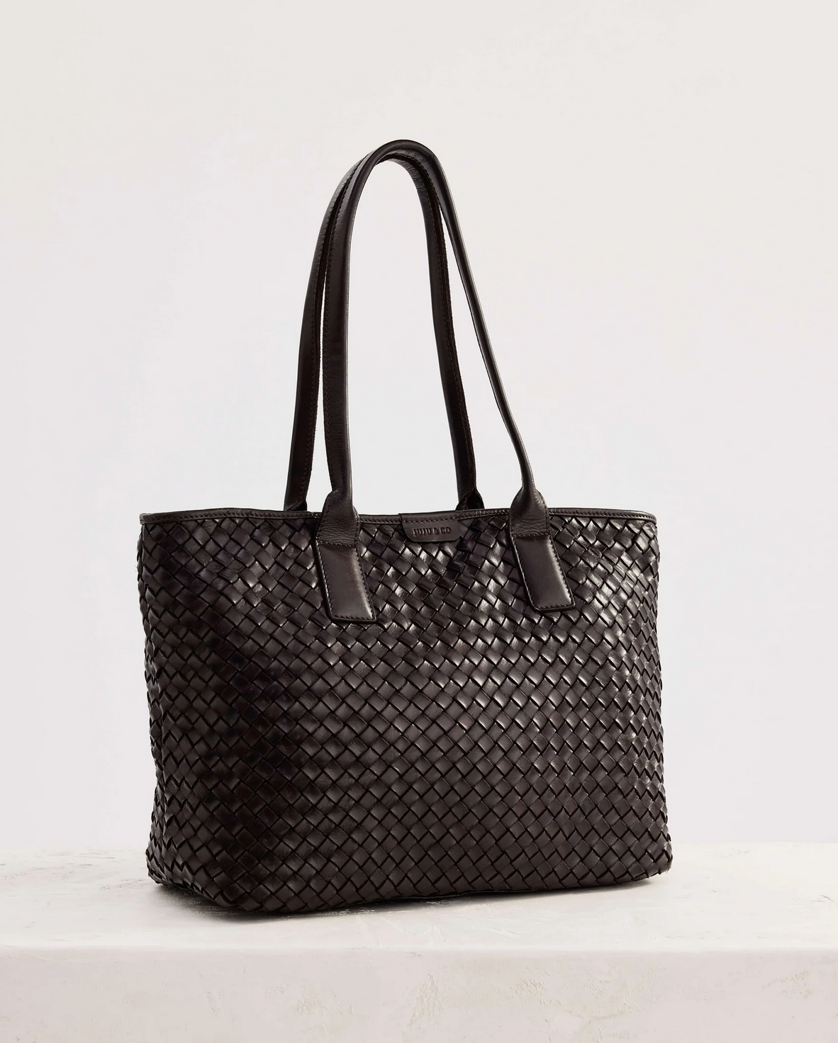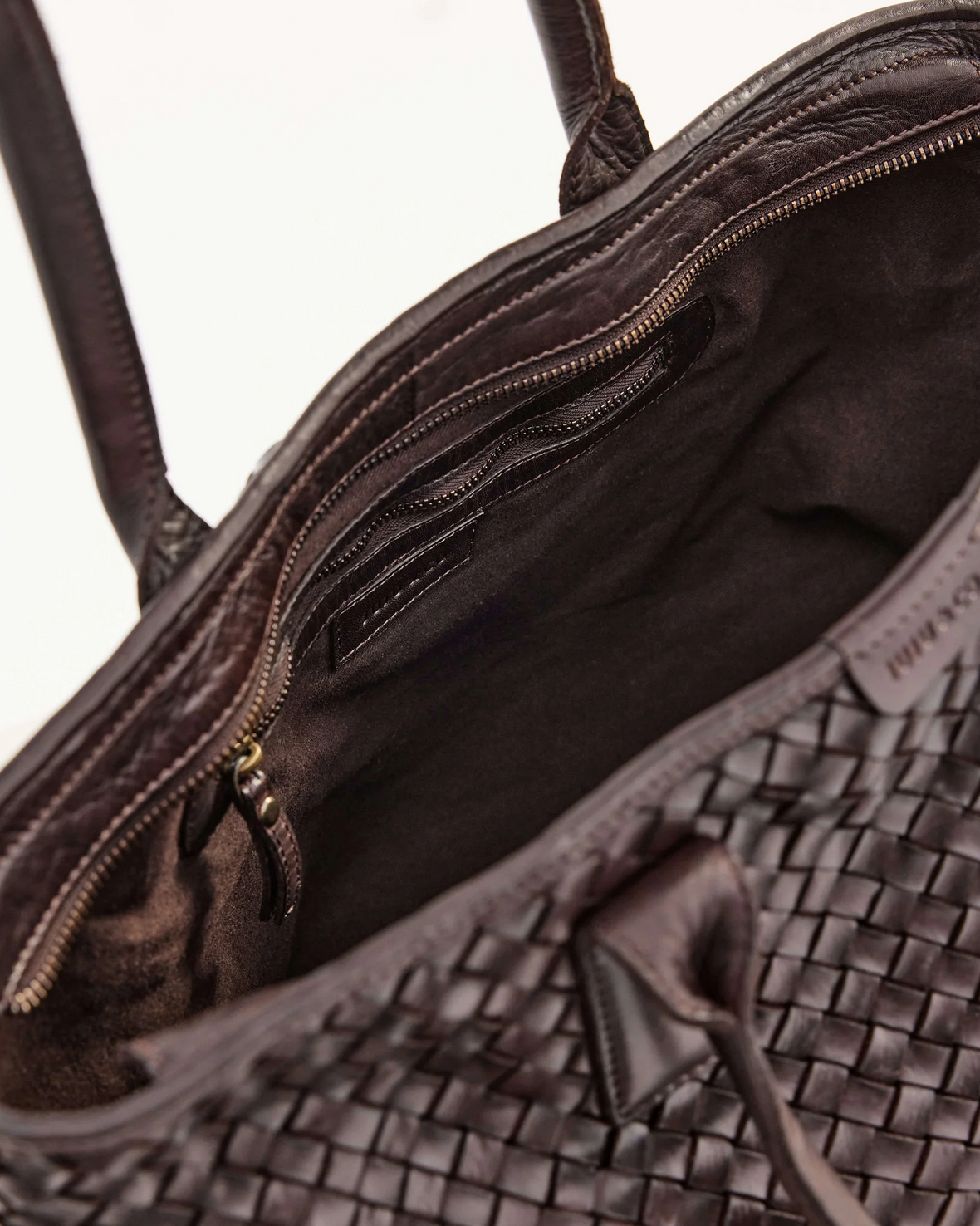 The Basque Tote in Chocolate is a large tote bag made from brown woven leather. This tote is the ultimate work bag, with ample space for a laptop, and a top zip closure to keep your things secure.