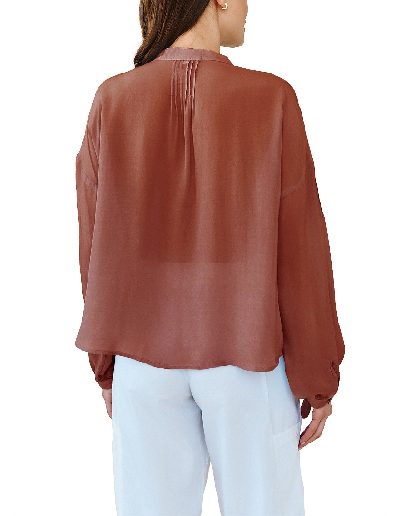 A lightweight, feminine blouse designed with effortless elegance. Crafted in a soft, fluid fabric, it features delicate pin tuck detailing along the front, a refined band collar, and a button-down closure. The relaxed silhouette is complemented by gently gathered long sleeves and a softly curved hem.