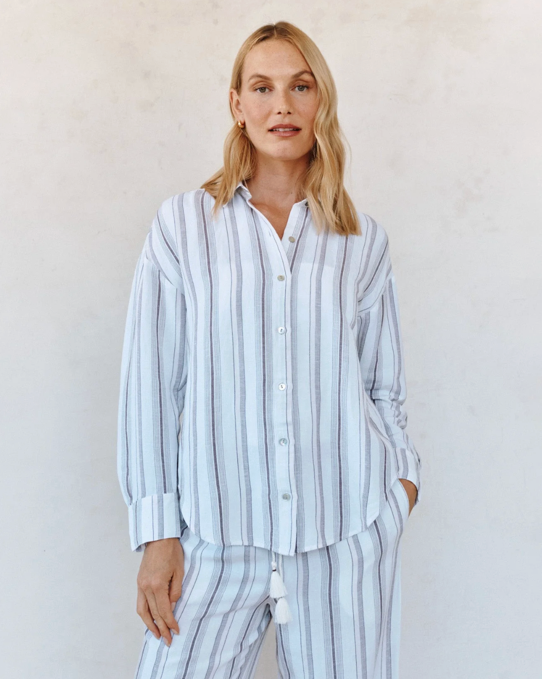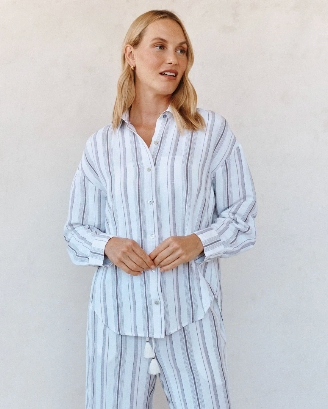 The Oversize Clean Shirt is a lightweight linen blend style designed for relaxed spring days with endless versatility, featuring a luxe linen blend that's delicate and airy with subtle texture and dimension, a relaxed-yet-tailored silhouette with an effortless drape that balances comfort with refined style, a full button-front closure that can be worn open over swimwear or buttoned for a polished look, and a soft cotton-blend fabrication that's breathable, durable, and comfortable for all-day wear.