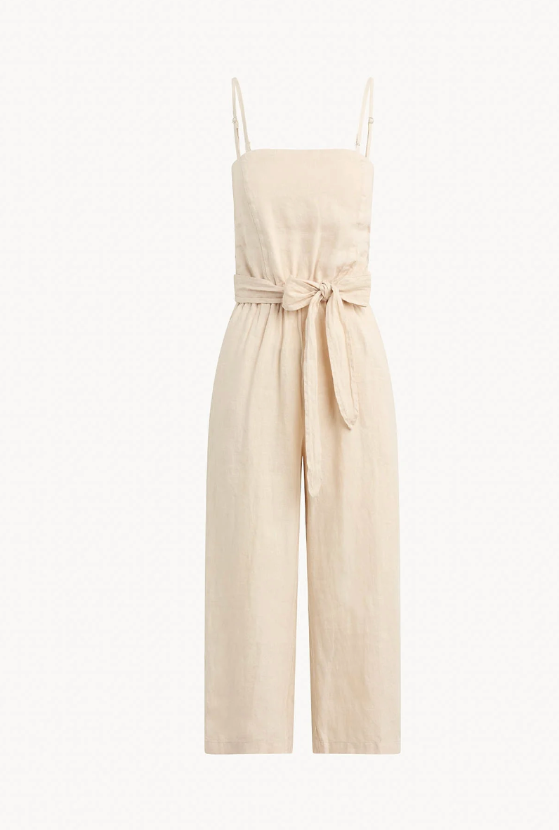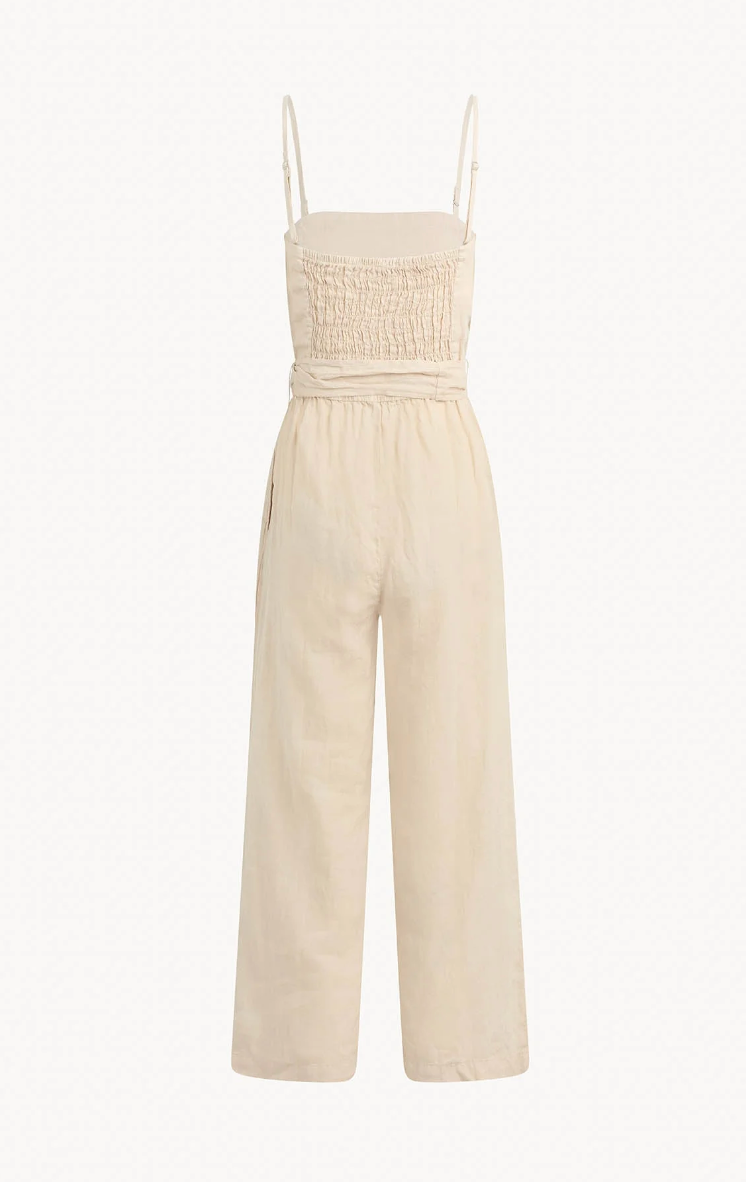 The Smocked Back Jumpsuit, designed from high-quality linen for a luxurious feel. This cropped length jumpsuit is perfect for any occasion, whether it be a daytime party or a night out on the town. Its versatile design allows for both casual and dressy styling options, making it a must-have addition to your wardrobe. 100% Linen