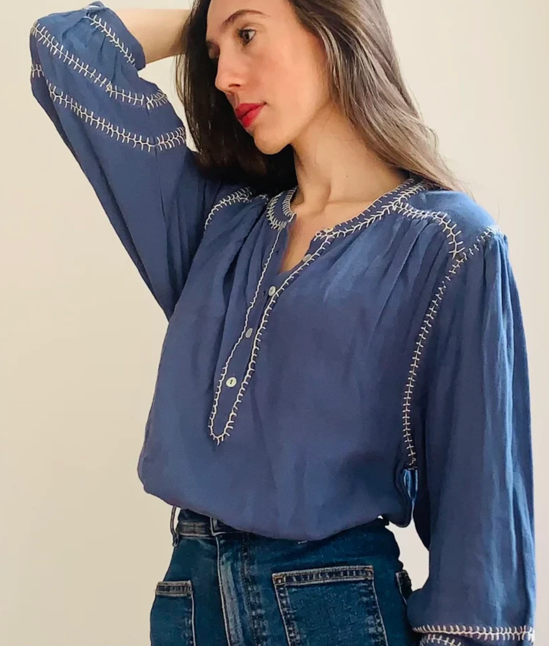 Marie Louise De Monterey Amelie Feather Stitch Blouse / Blue