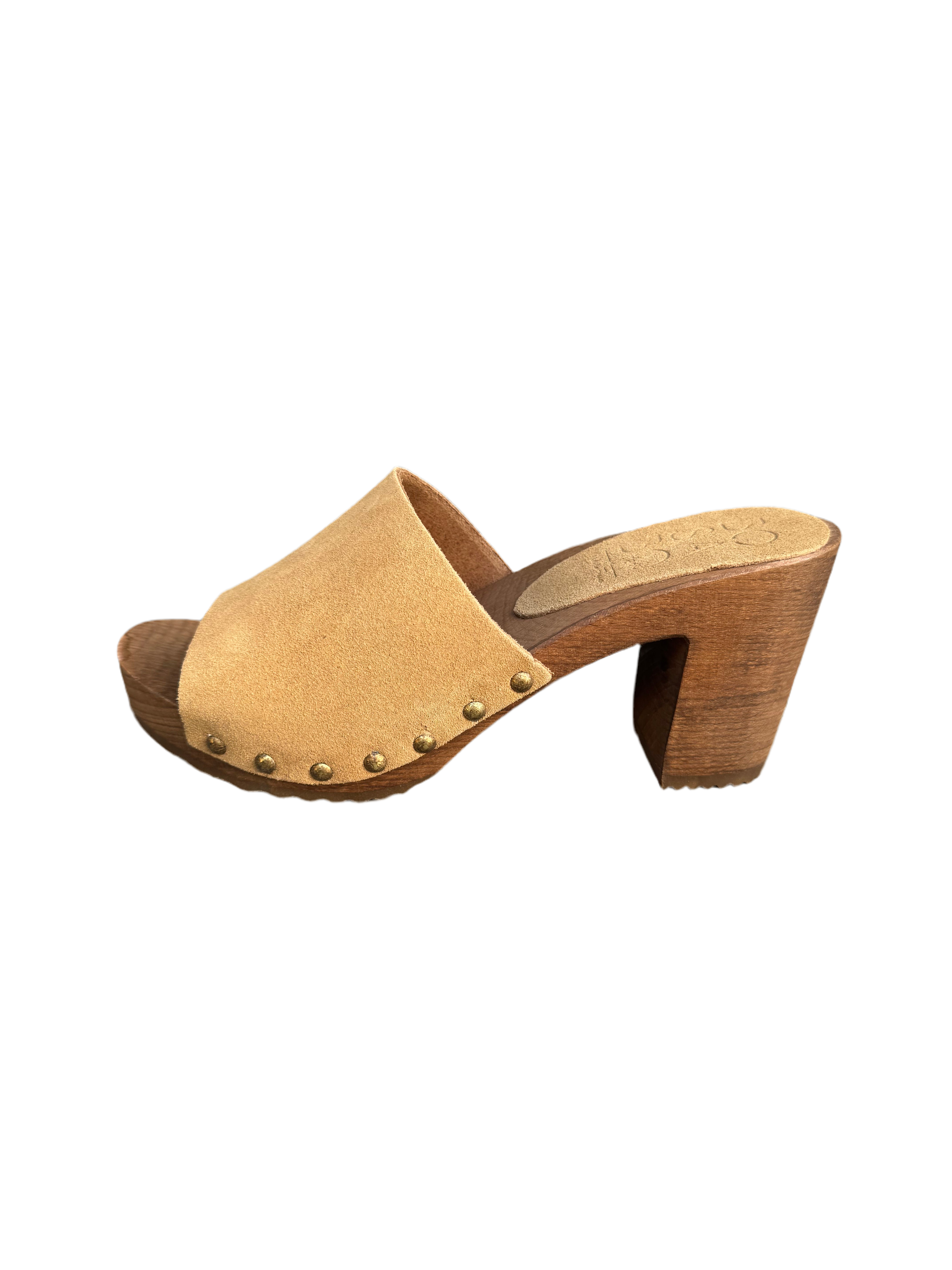 Handmade classic high Heel mules with a tinted brown wood sole, finished with bronze nails. Upper in light tan suede