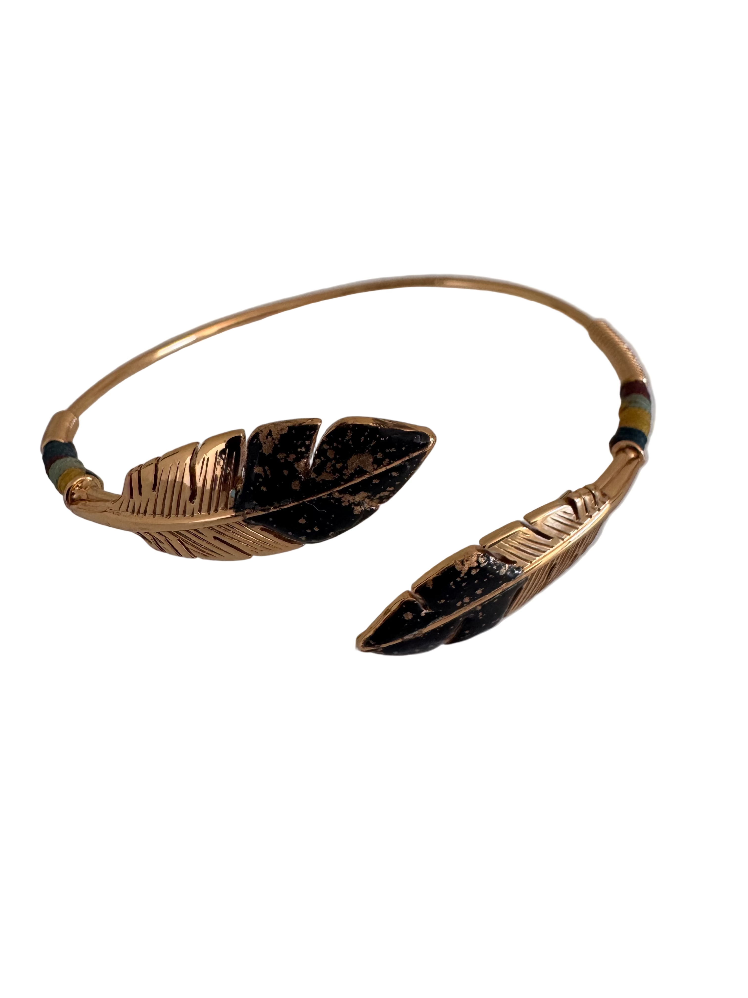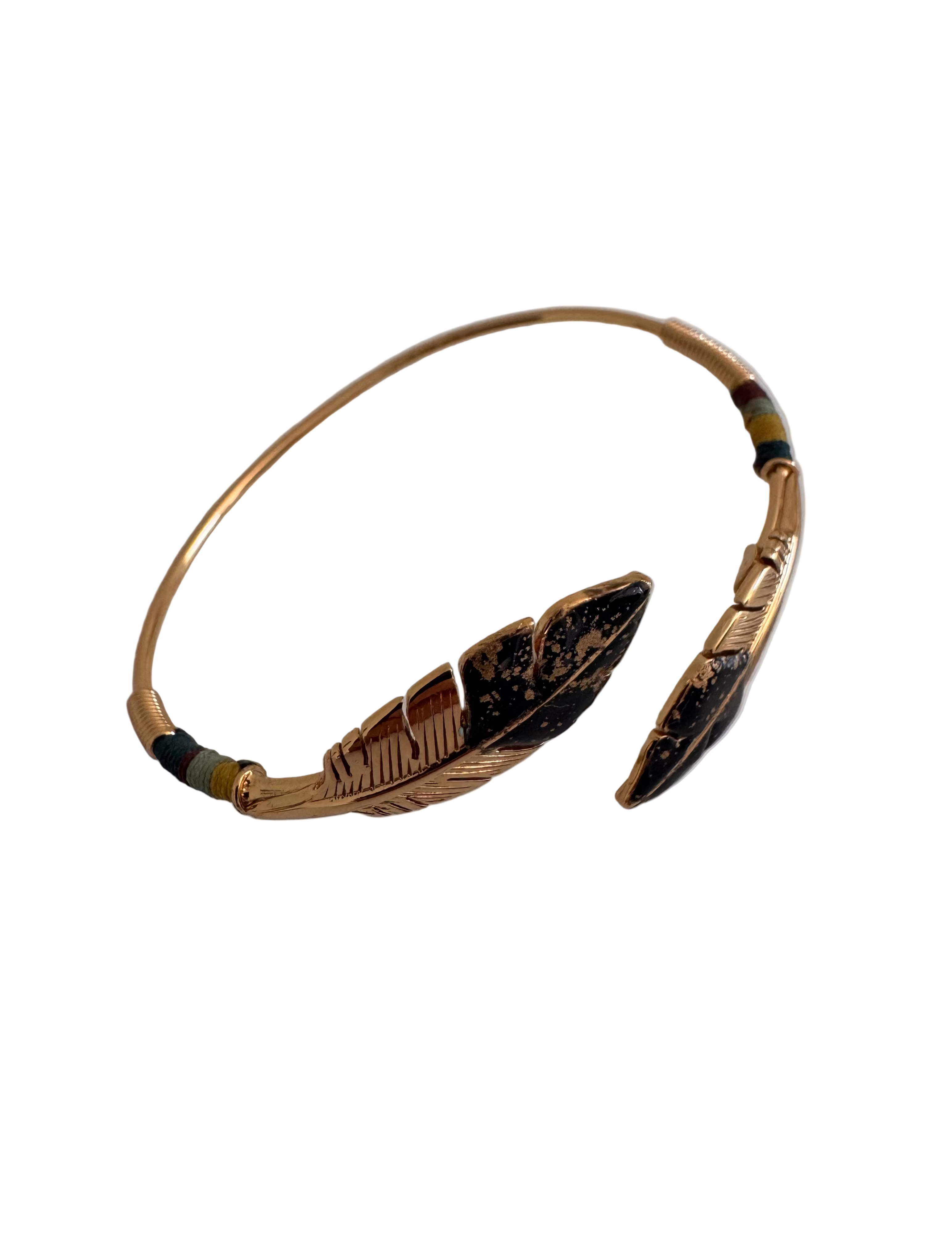 Gold plated cuff composed of two feathers, wrapped in part by cotton threads.