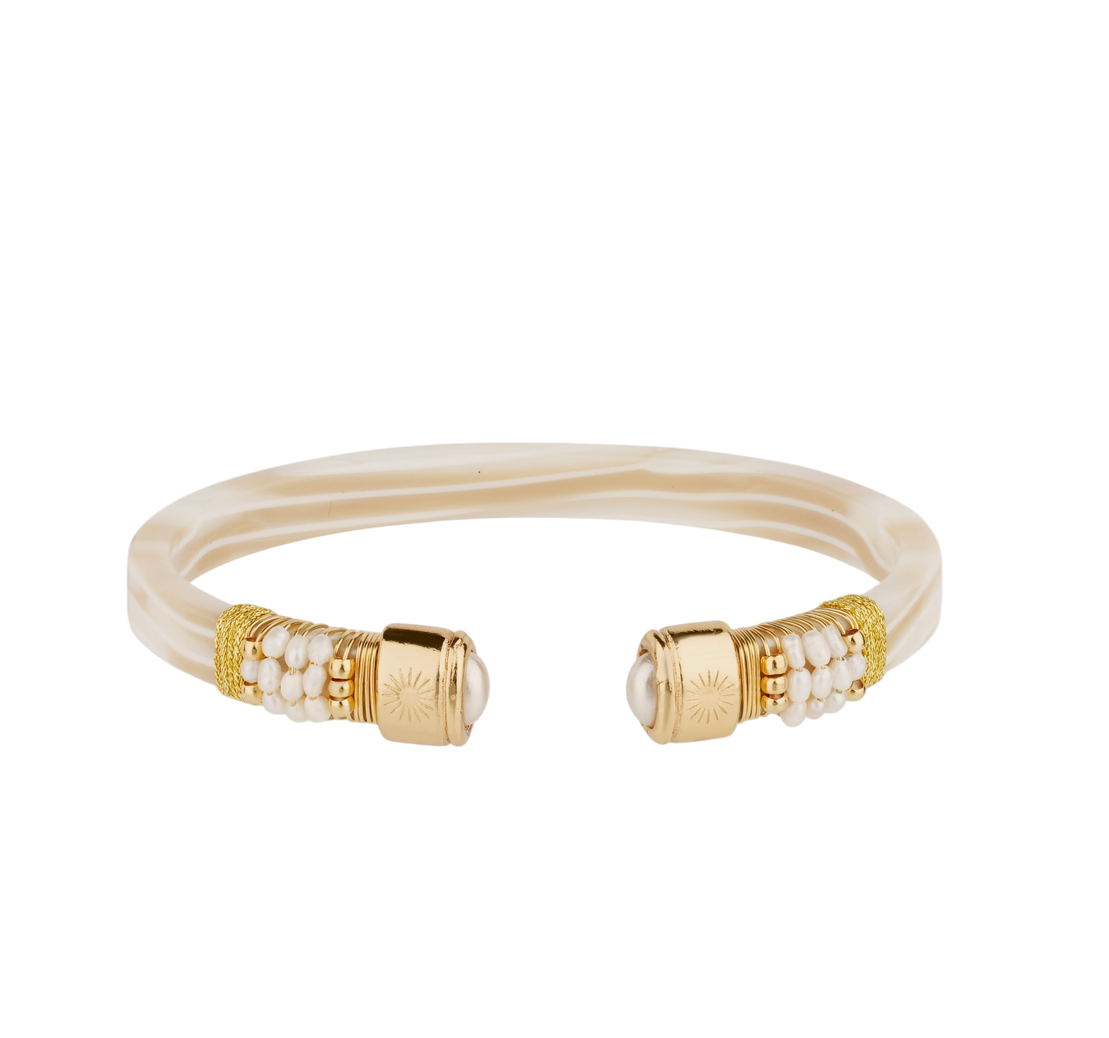 Fine acetate bangle bracelet wrapped in colored threads. This bracelet is ended by two gold plated ends adorned with gemstones cabochons.