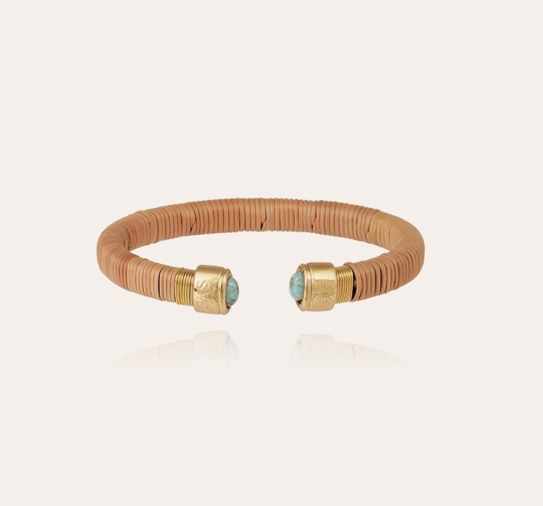 A fine acetate rush, wrapped with a delicate wicker thread and a fine metal wire. The bracelet ends with two gold-plated balls set at the ends. It is positioned with the balls on the top of the wrist and can thus be matched with another Sari or Sarina bead.