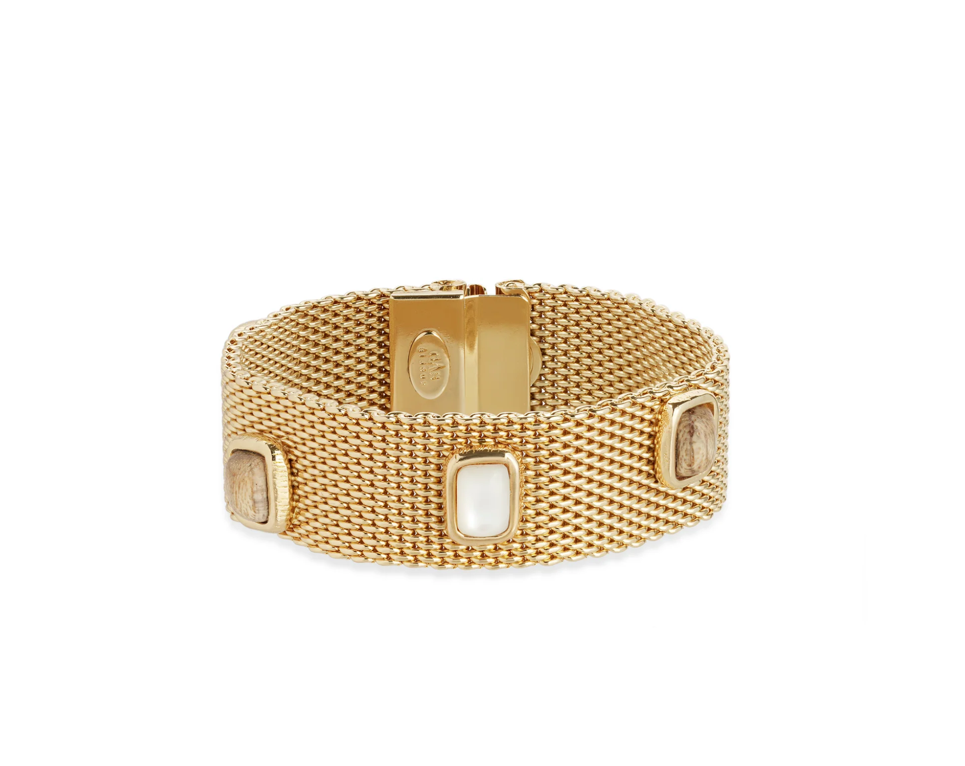 Bracelet composed of a gold plated mesh finely assembled and adorned with white Mother-of-pearl and wooden medallions.
