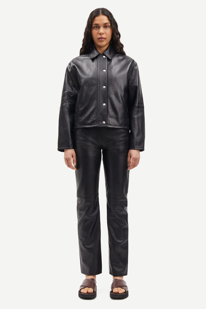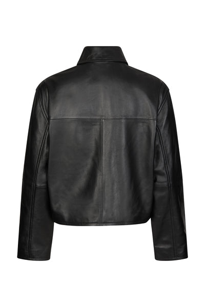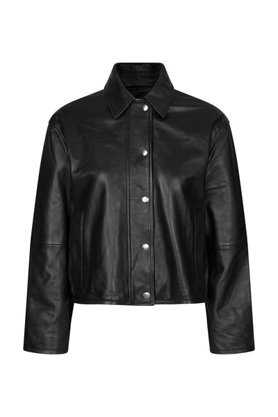 Boxy fitting leather jacket with dropped shoulders. Pointed collar, press button fastening, front welt pockets. Back neck yoke, panelled seams. Satin lining. Lambs leather. This product contains leather sourced from LWG-certified suppliers. LWG promotes responsible environmental practices across the leather supply chain.