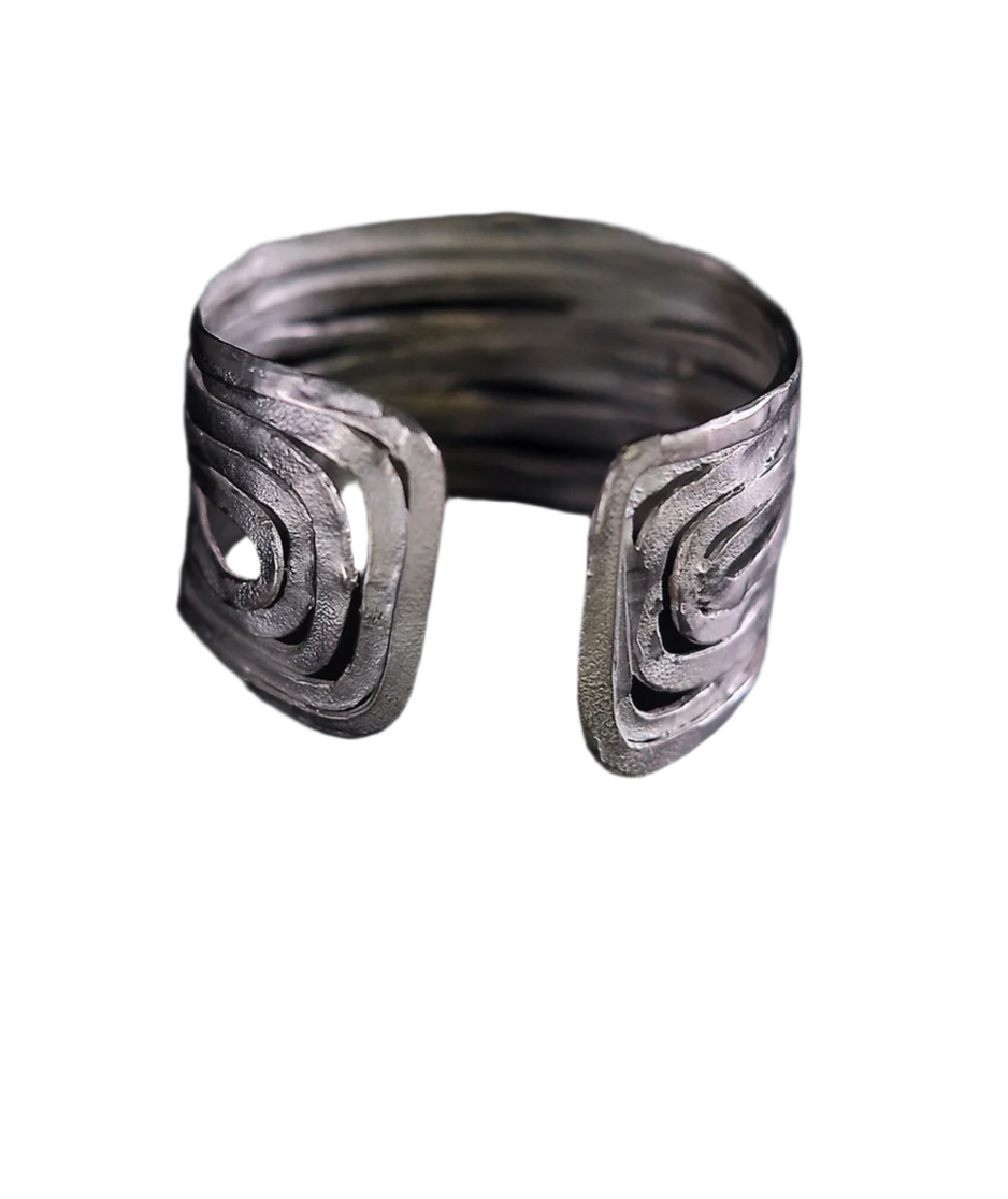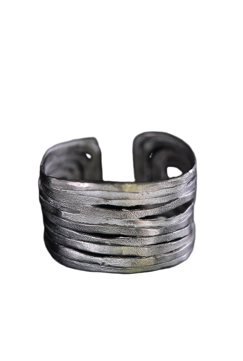 Handcrafted from multiple hand cut strips of sterling silver, this statement piece exudes elegance and sophistication. Its unique design ensures it remains a timeless classic in the EWA collection. Each cuff is uniquely textured, adding to its exclusive charm.