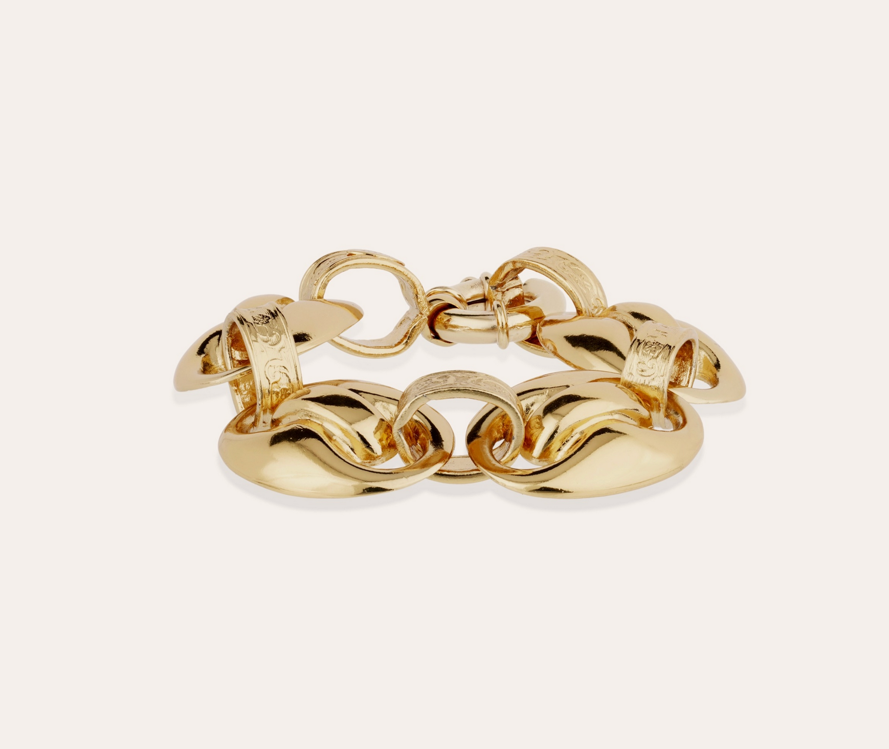 The Cophea bracelet, with fine golded-plated, are inspired by nautical chain links. Featuring rounded, hand-polished, adorned with delicately engraved rings. A couture piece that combines lightness with bold style.