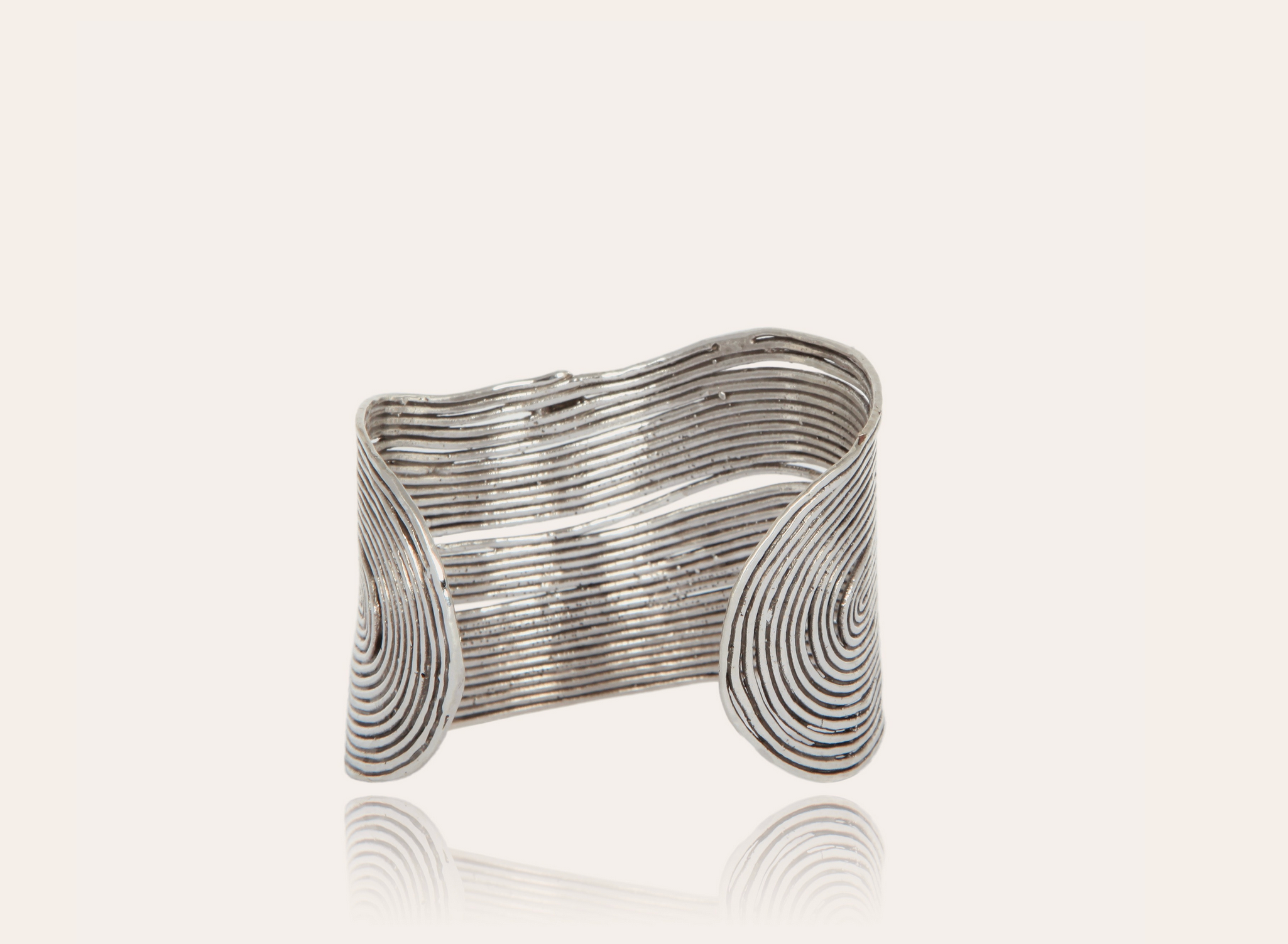 Silver-plated bracelet finely worked of stacked metallic threads, the cuff is hand-hammered. Adjustable size.