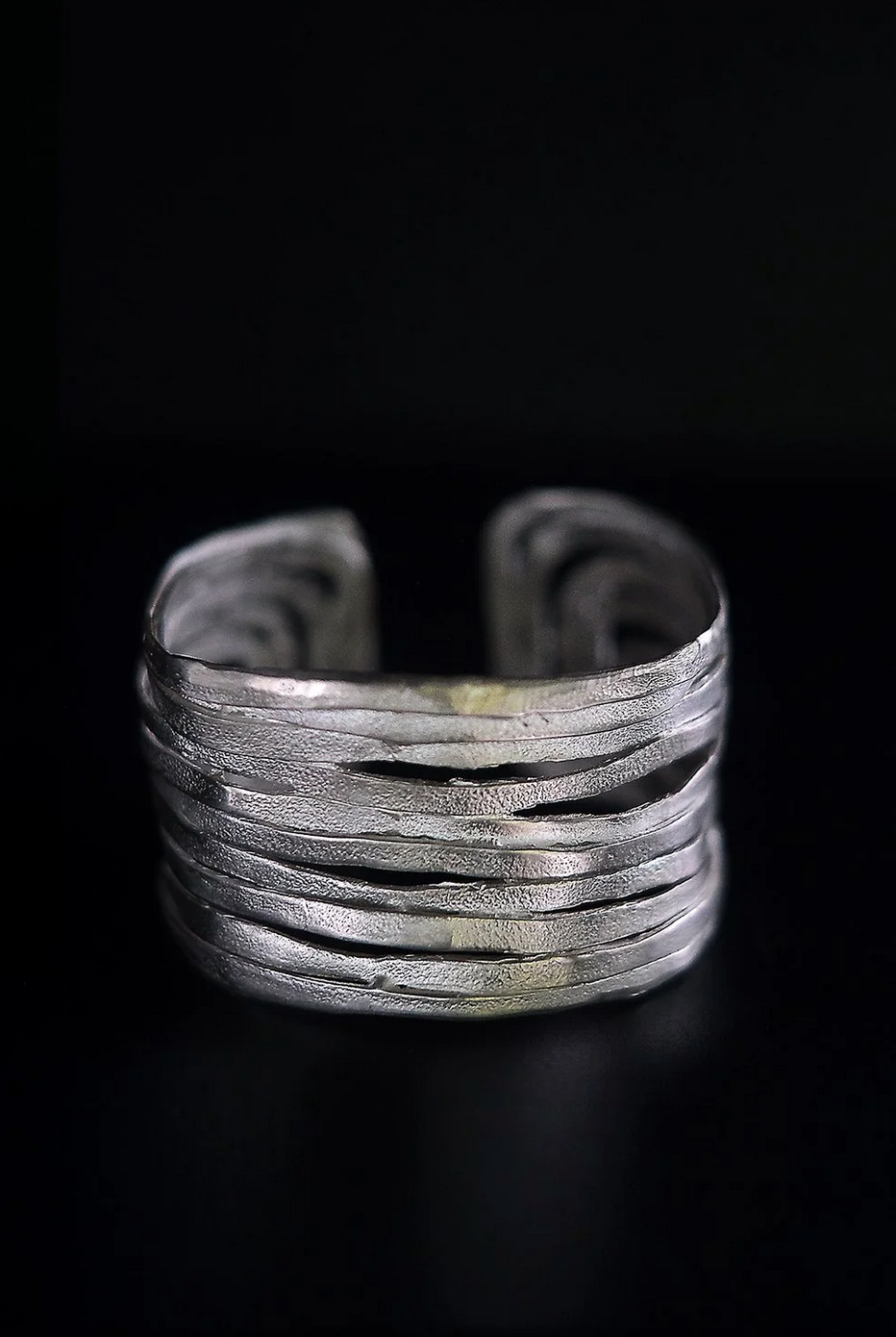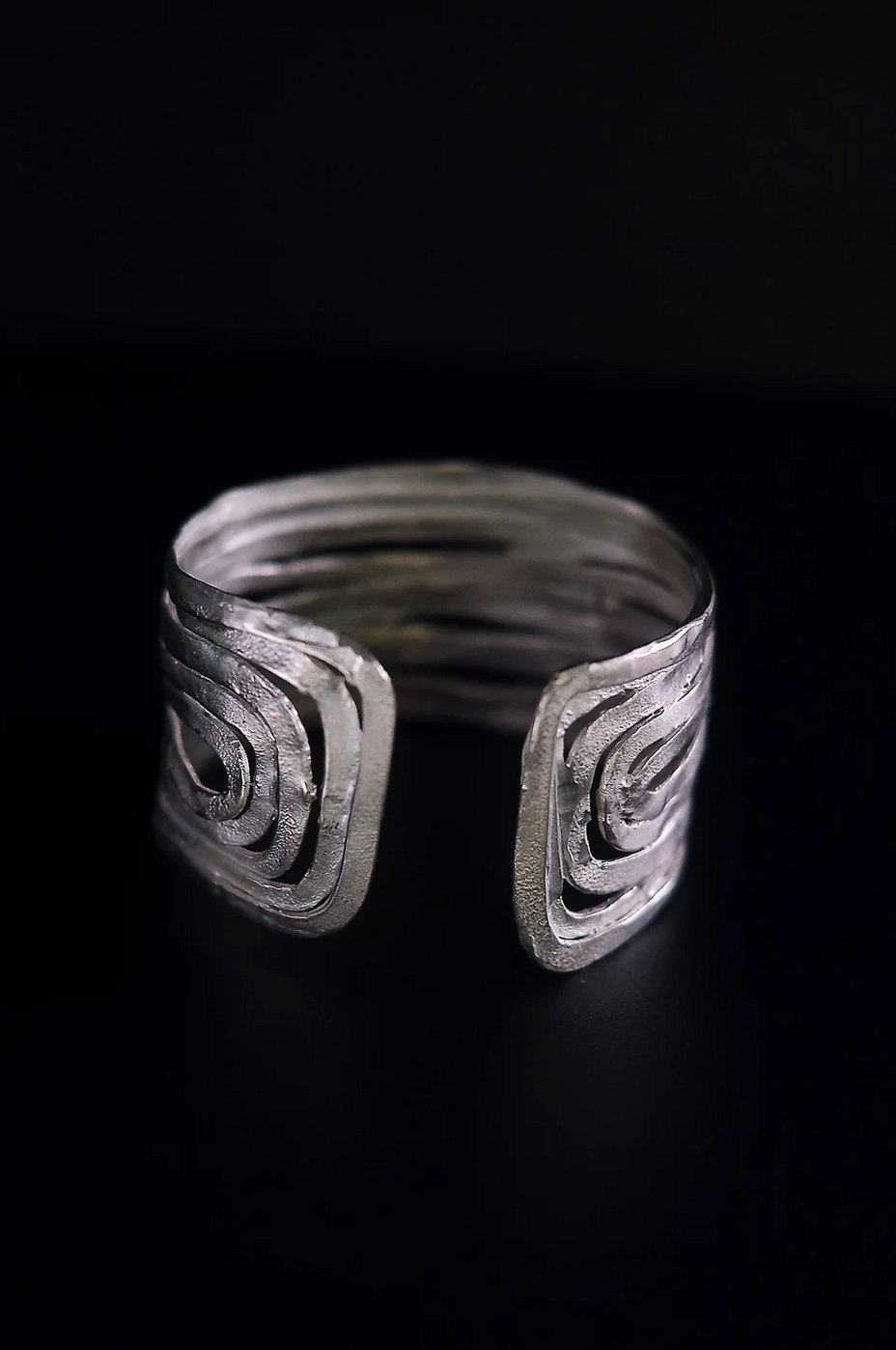 Handcrafted from multiple hand cut strips of sterling silver, this statement piece exudes elegance and sophistication. Its unique design ensures it remains a timeless classic in the EWA collection. Each cuff is uniquely textured, adding to its exclusive charm.