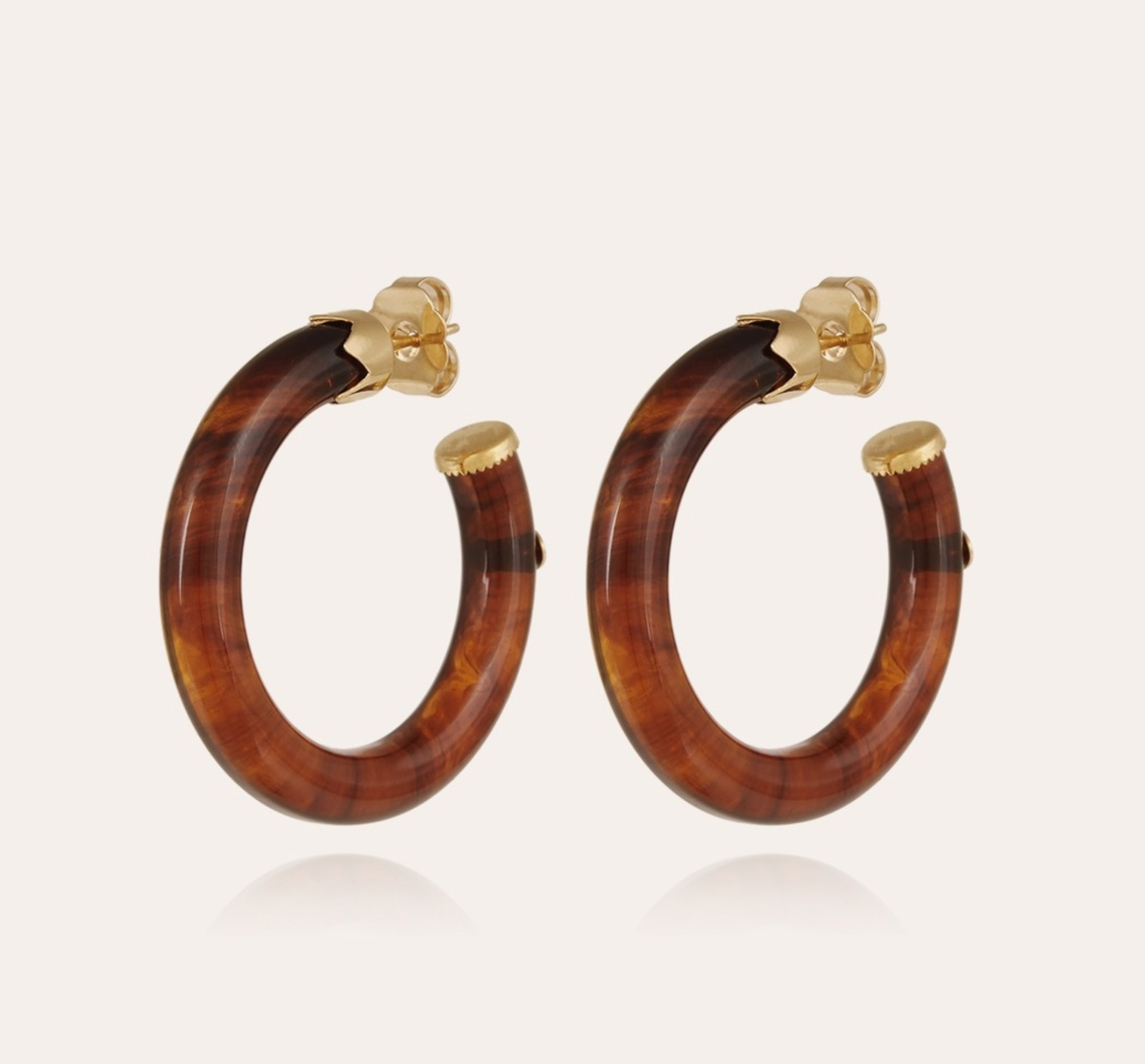 Acetate hoop earrings delicately hand-polished. These earrings have gold plated ends.