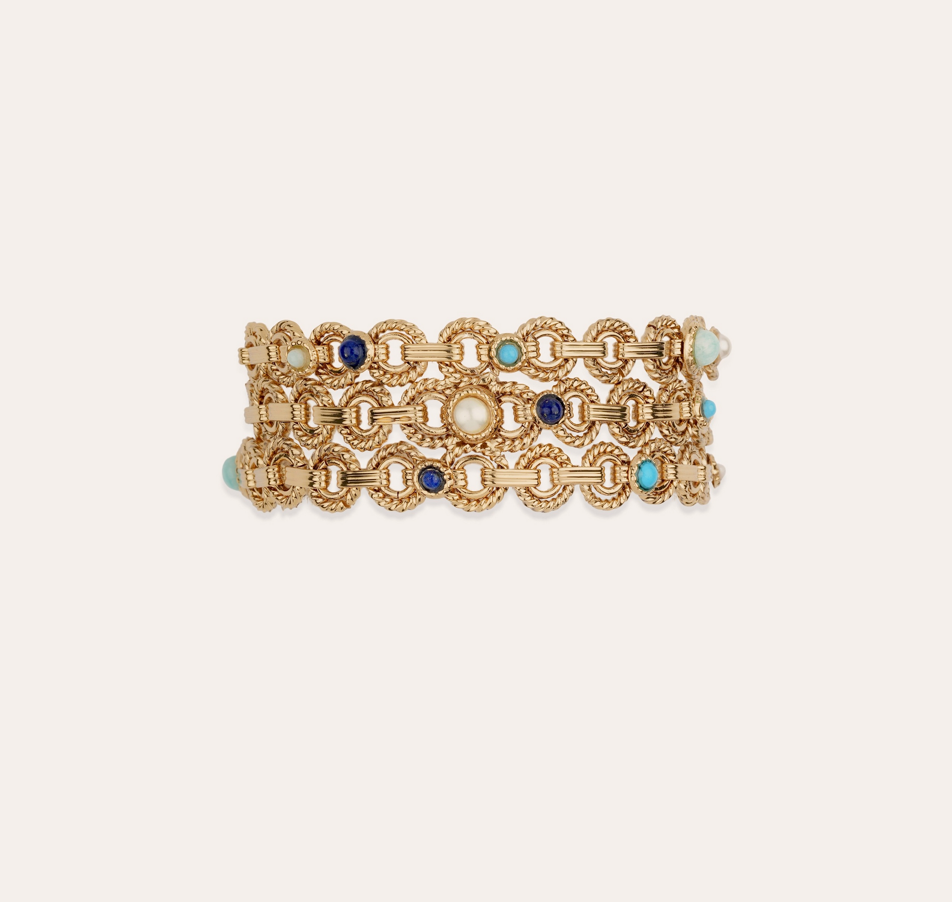 Gold plated bracelet composed of dainty twisted rings adorned with gemstones.