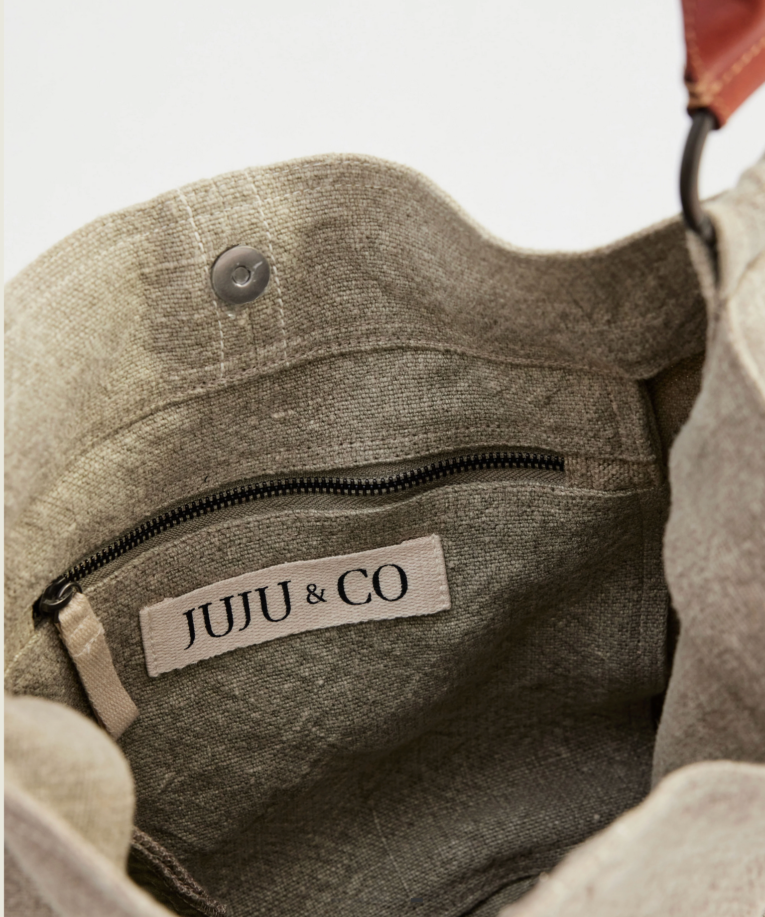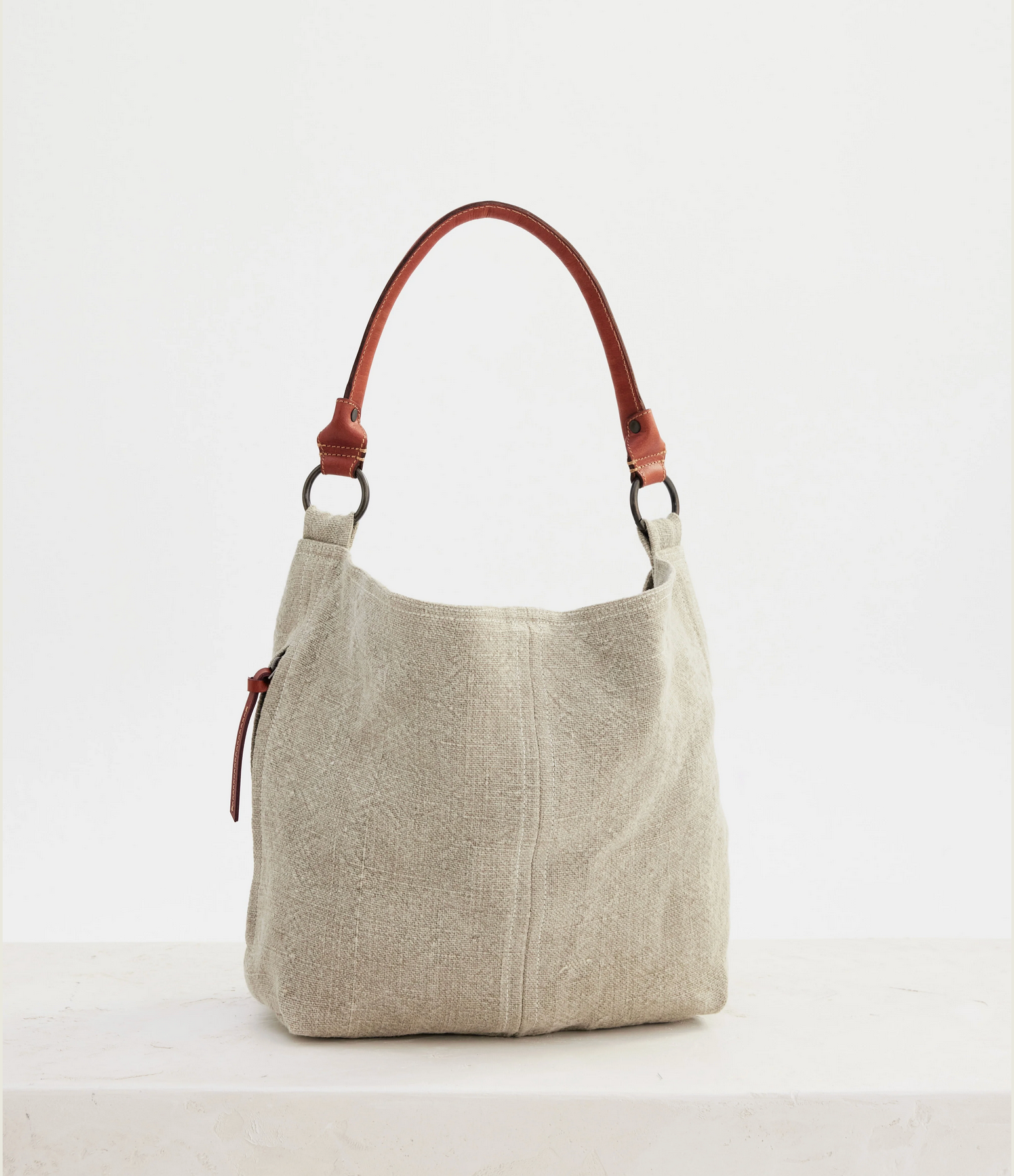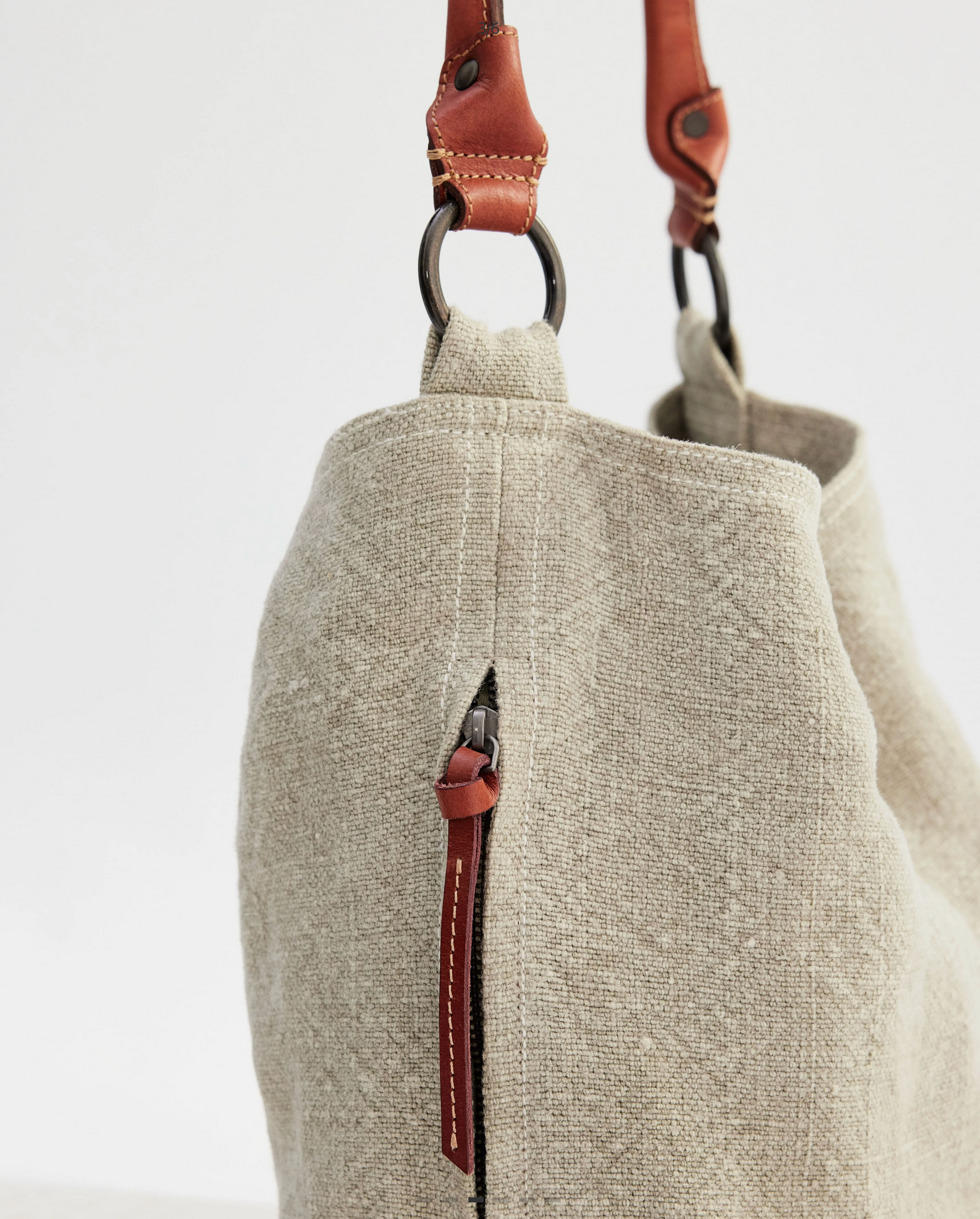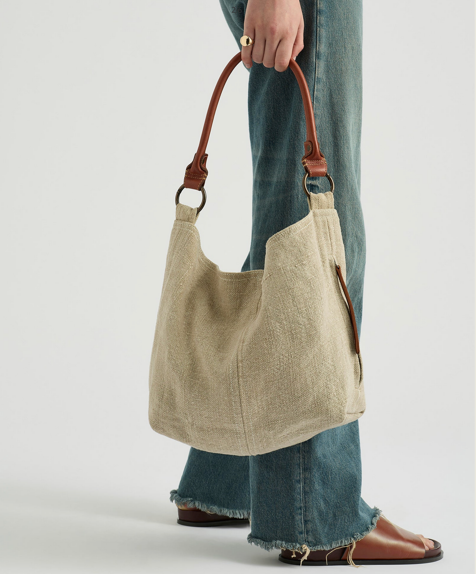 The Sunday Slouchy features our Baby Jute size body with a rolled Italian belt leather strap. The handle is detachable with a clip-on O-ring. It has a magnetic closure, internal zip pocket, and side zip pocket. Made from organic vegetable-dyed jute with an updated premium Italian belt leather handle.