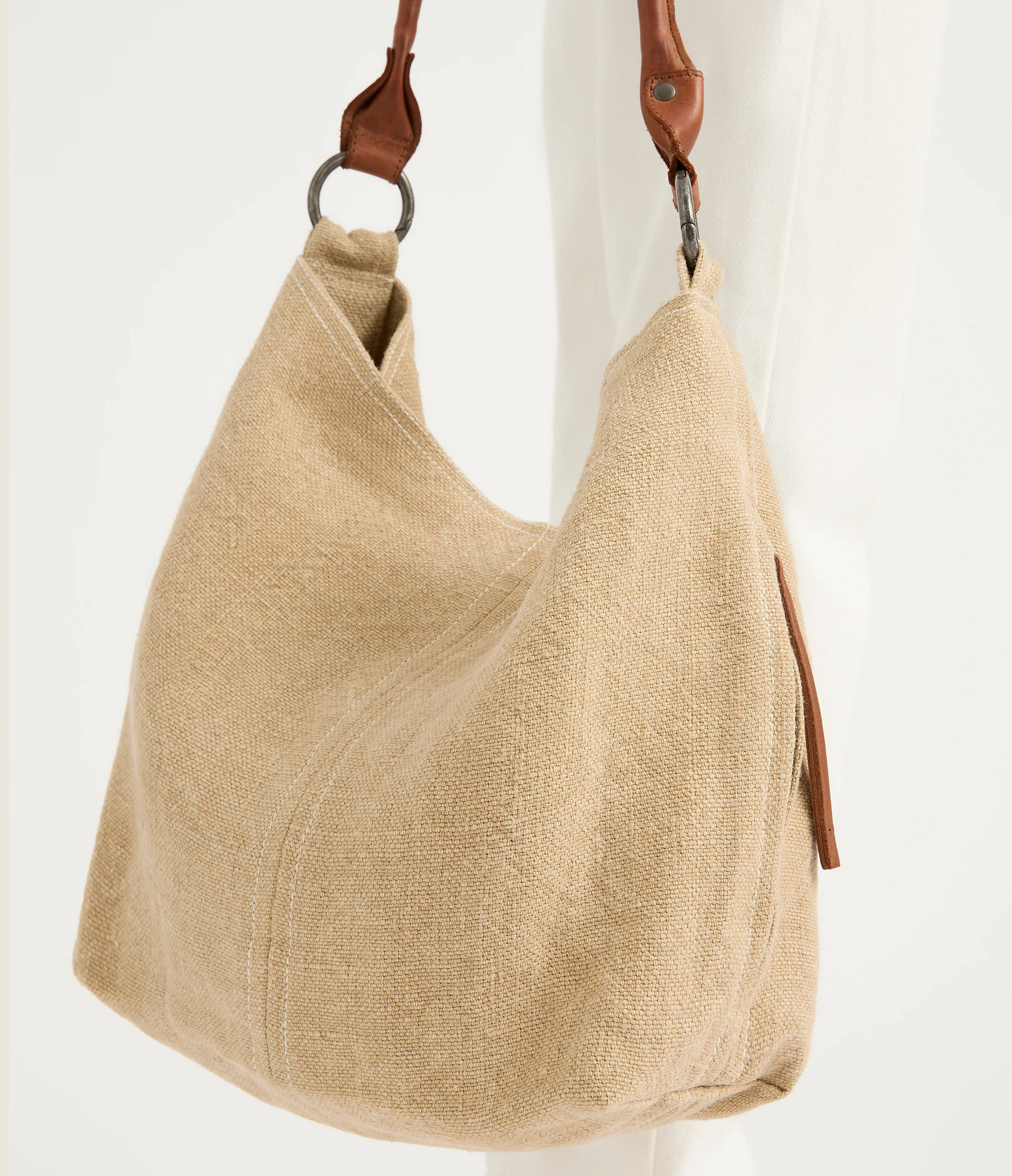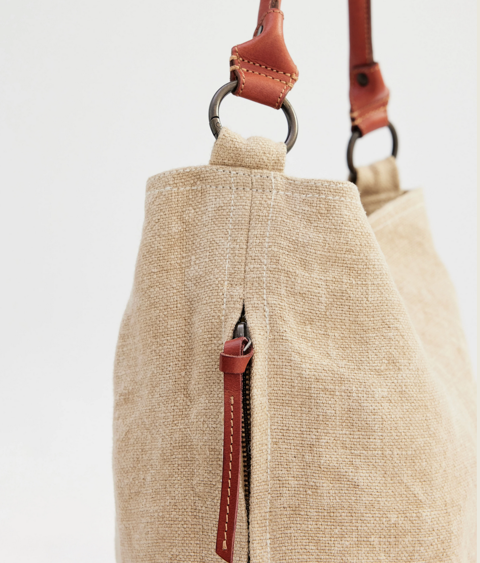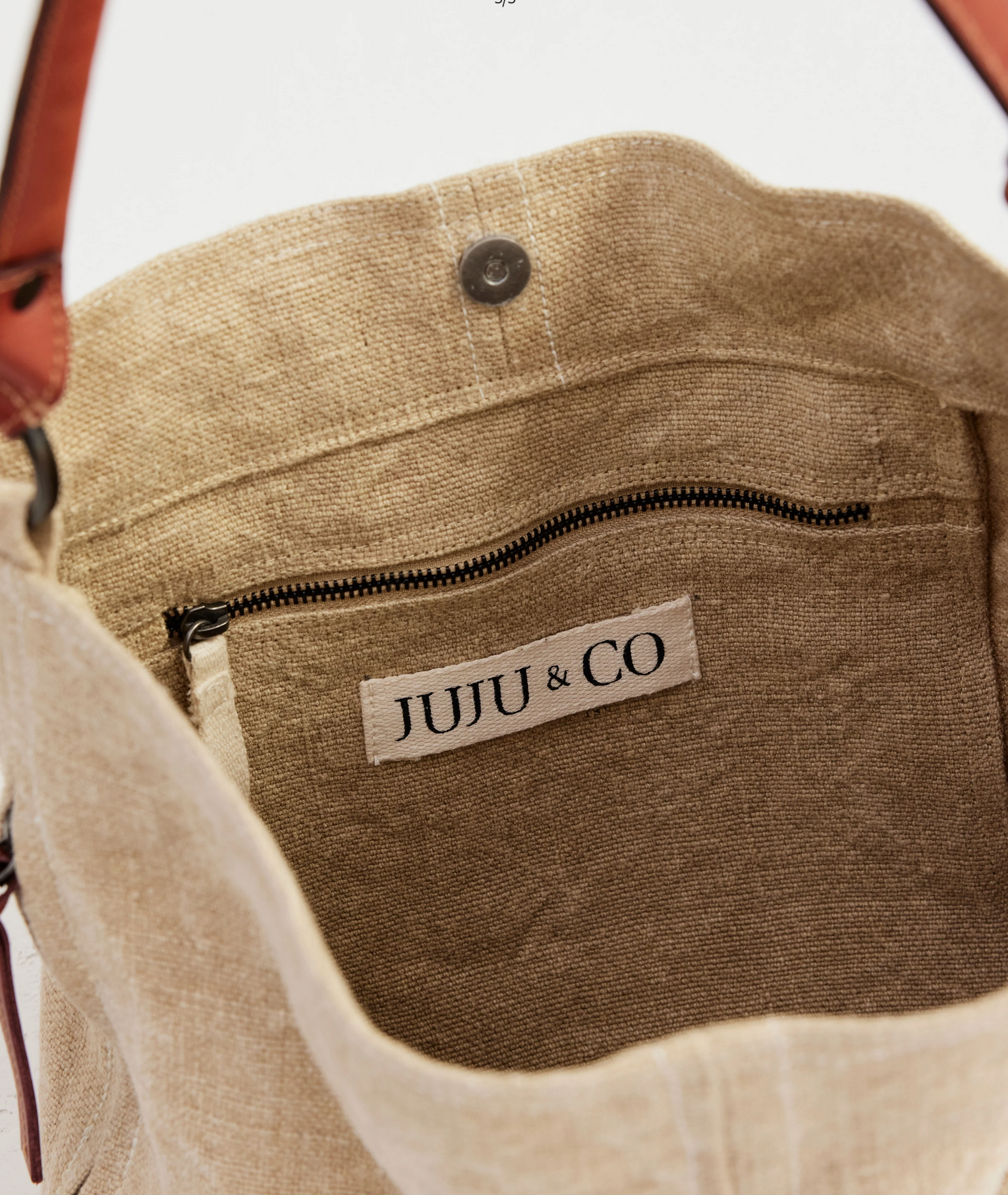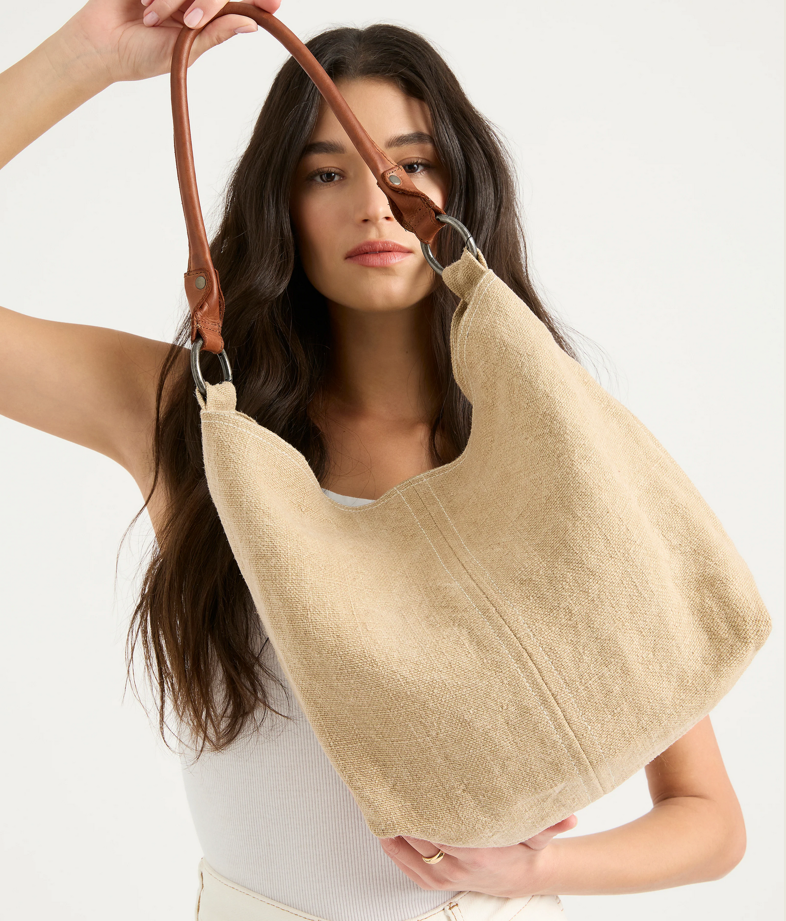 The Sunday Slouchy features our Baby Jute size body with a rolled Italian belt leather strap. The handle is detachable with a clip-on O-ring. It has a magnetic closure, internal zip pocket, and side zip pocket. Made from organic vegetable-dyed jute with an updated premium Italian belt leather handle.