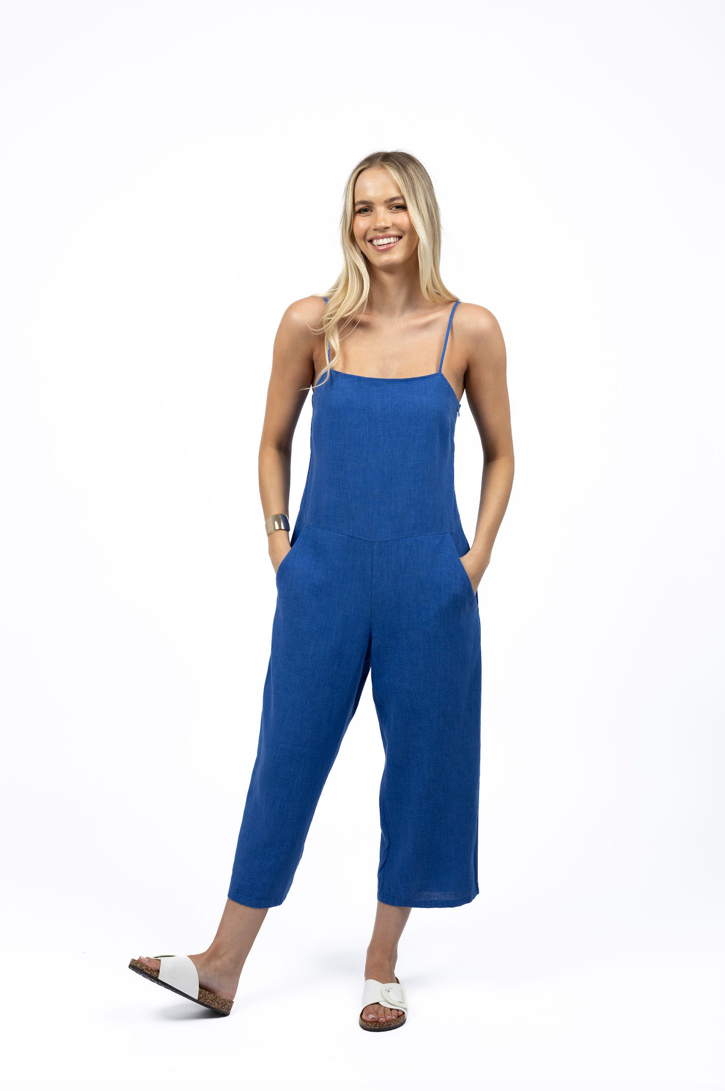 A playful, comfortable jumpsuit that doubles as a one-outfit wonder – Also looks great with a fitted t-shirt or tank. Crafted from a breathable linen blend, featuring ramie cotton and tencel (an eco-friendly yarn).