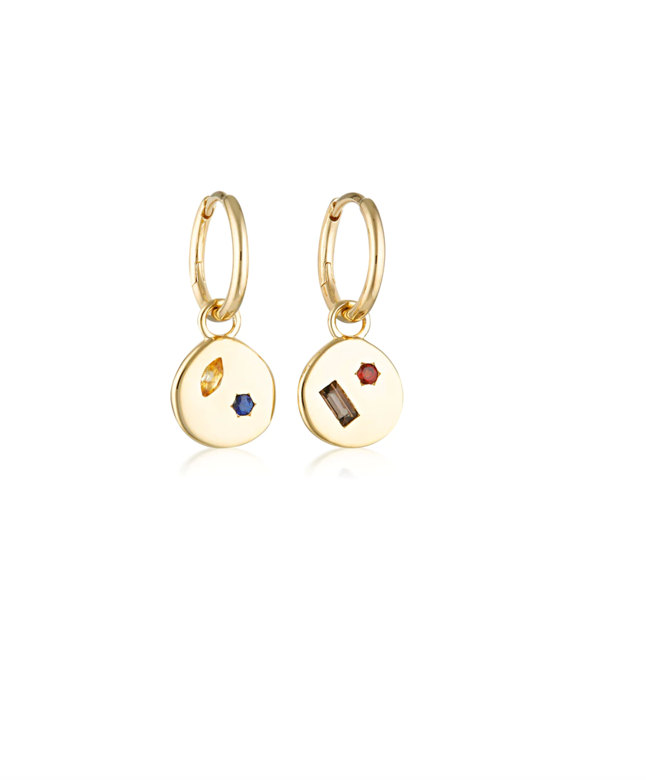 The Kaleidoscopic Charm Huggie Earrings feature two mismatched earring charms with two gemstones on each, on our vital huggie hoops. Featuring baguette smokey quartz, marquise citrine, round garnet and round sapphire stones. The charms are removable, so the hoops can be worn with or without the charms. Ethically crafted in recycled sterling silver, with a polished finish.