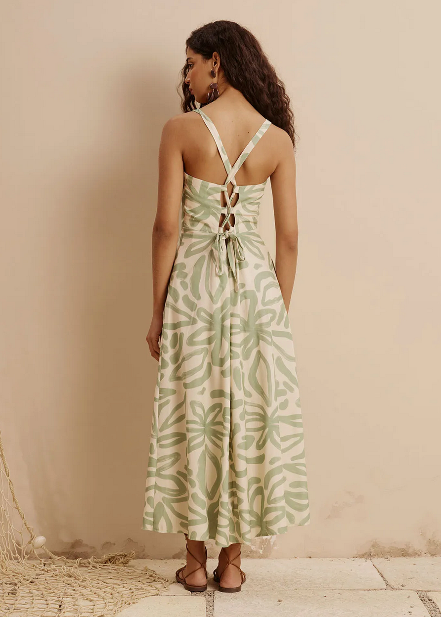 CaCay Jari Printed Midi Dress with Overlay Yoke / Medium Green