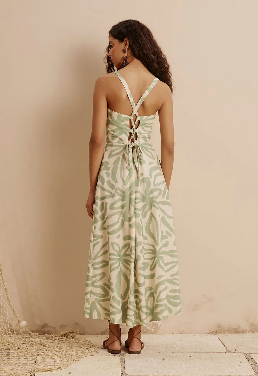 CaCay Jari Printed Midi Dress with Overlay Yoke / Medium Green