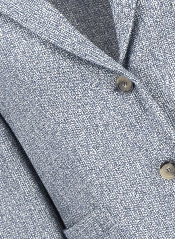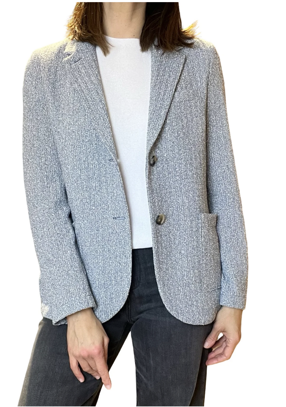 The Harris Wharf London Frisé Bicolor Denim Blazer combines contemporary design, texture and urban sophistication. This two-button blazer is made of two-tone frisé fabric with a denim finish, providing a unique texture and modern visual that makes it stand out in any wardrobe. Its structured cut with classic lapels and soft shoulders offers an elegant and versatile silhouette, ideal for both office looks and casual chic combinations with denim or dress pants. Its lightweight design without interior lining makes it a comfortable and easy-to-wear garment in multiple seasons.