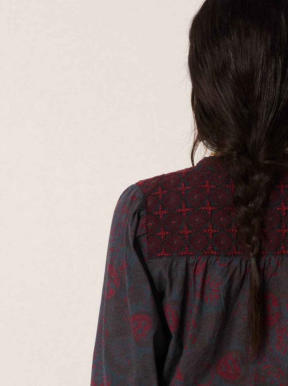 Voile cotton, light and semi–sheer, embroidered with a scattered floral pattern that beels almost hand-drawn. A blue nearing midnight, softened to ink by time.