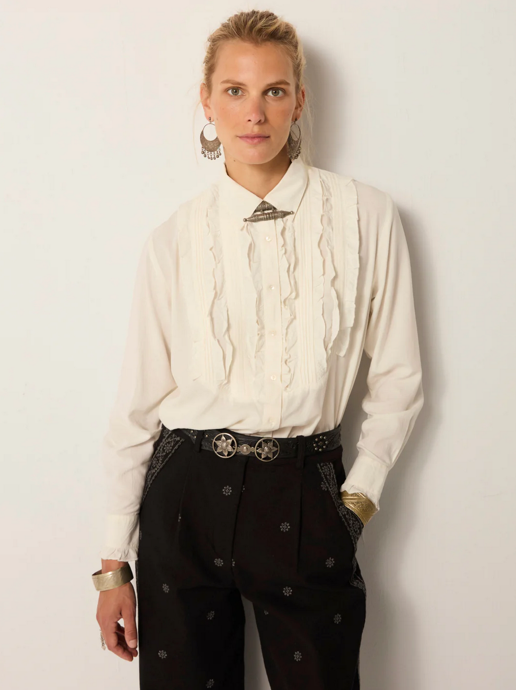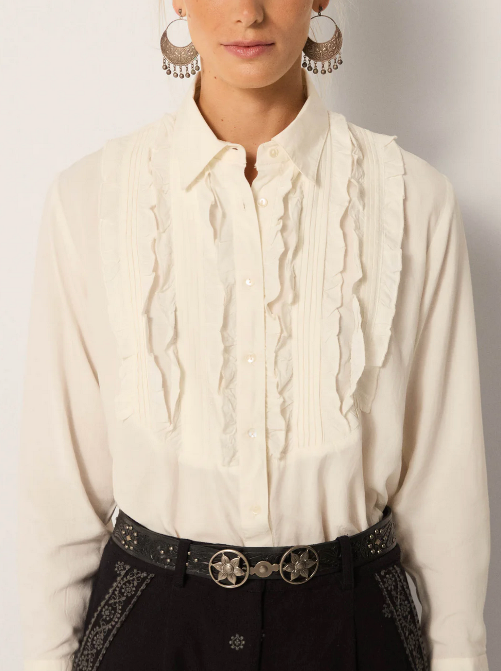A cascade of pintucks and ruffles runs down the front, blending sharp tailoring with romantic detail. The balance of contrast gives it bite without losing elegance.