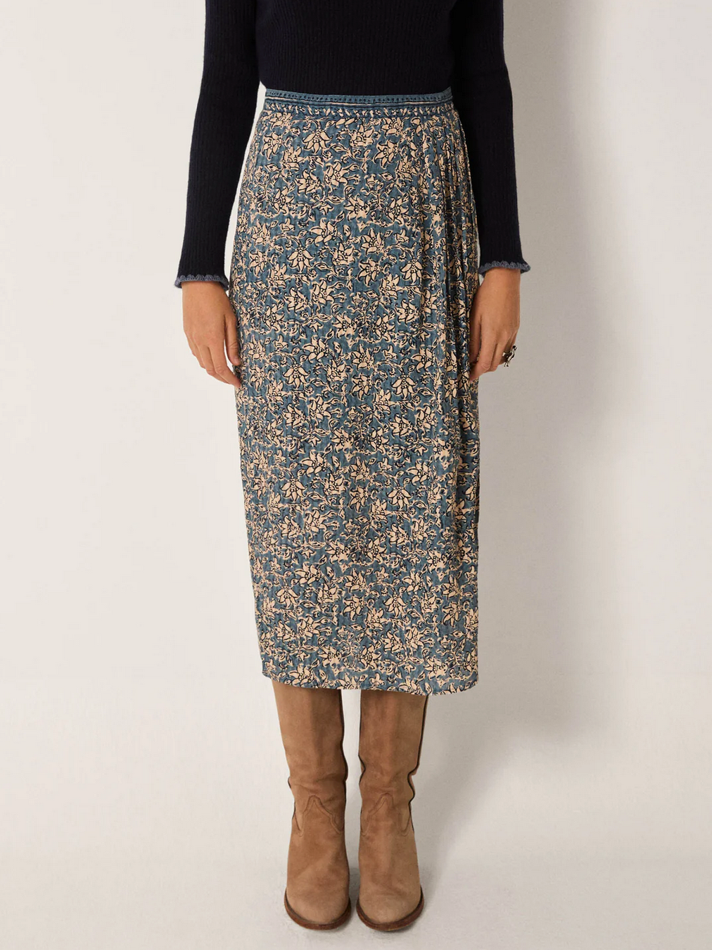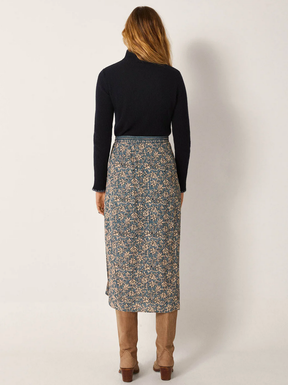The cut is straight with a midi length, skimming the hips before dropping clean. A narrow waistband keeps it simple, while a side pleat adds a touch of movement.