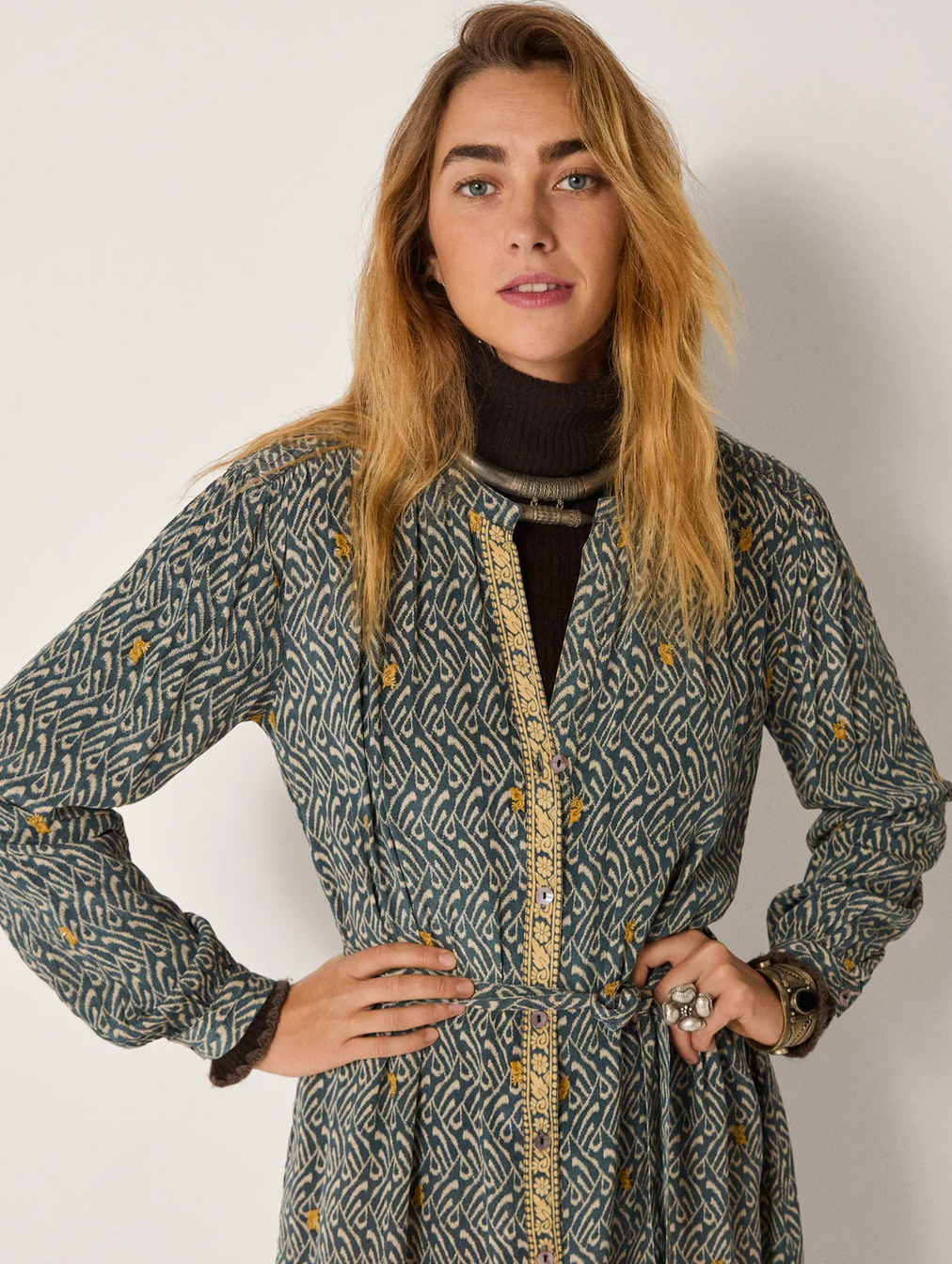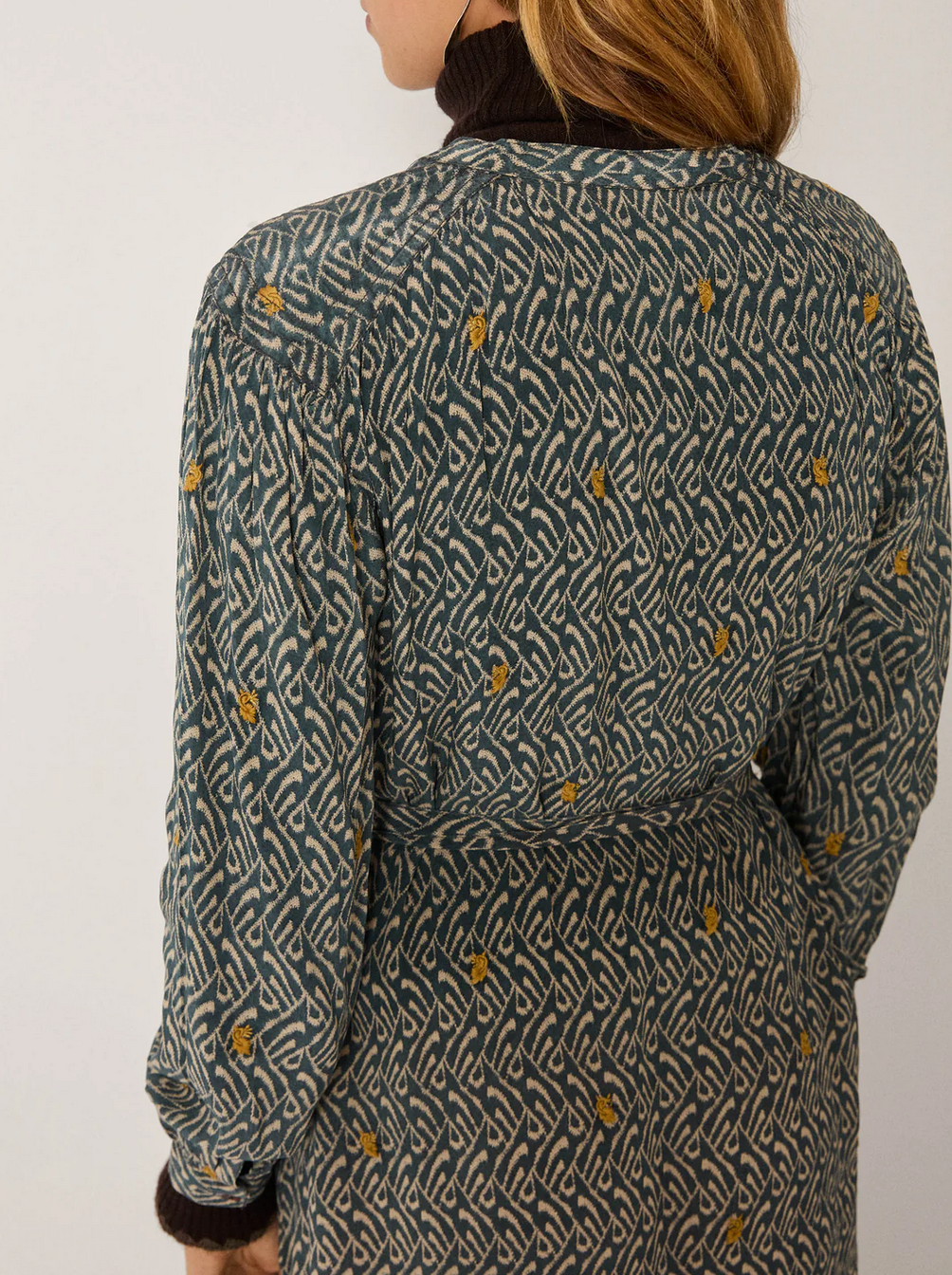 Katrina viscose printed with a Savannah motif — deep green base, small golden accents scattered like petals on stone. A long line broken by a vertical embroidered trim, the kind of detail that feels both folk and talismanic.