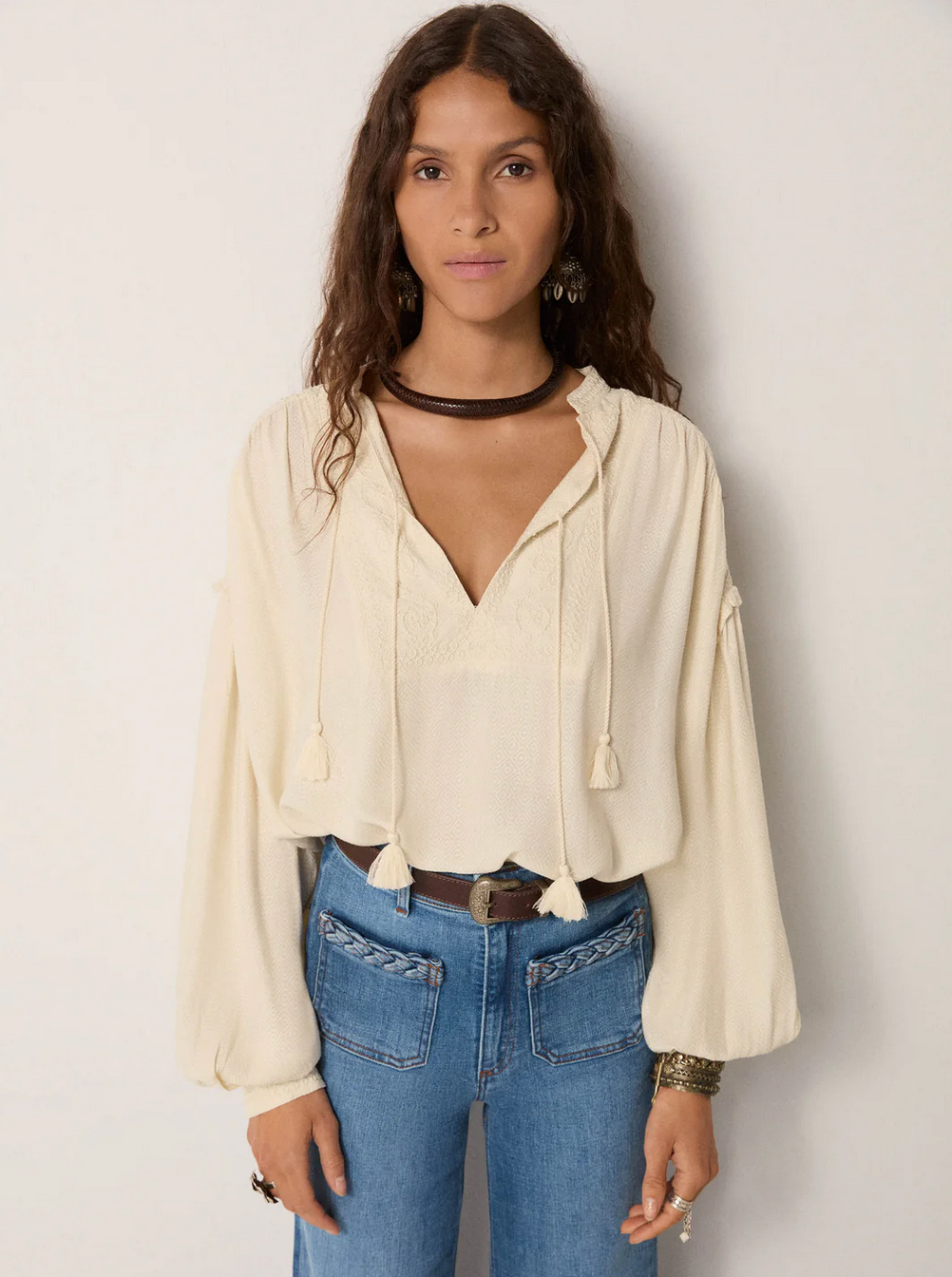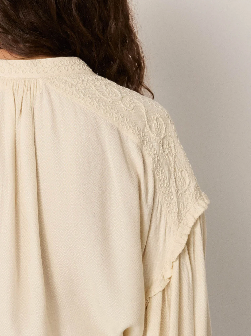 A viscose jacquard dobby with a diamond motif gives this blouse a subtle depth of texture. Its soft ivory tone keeps it timeless and adaptable.
