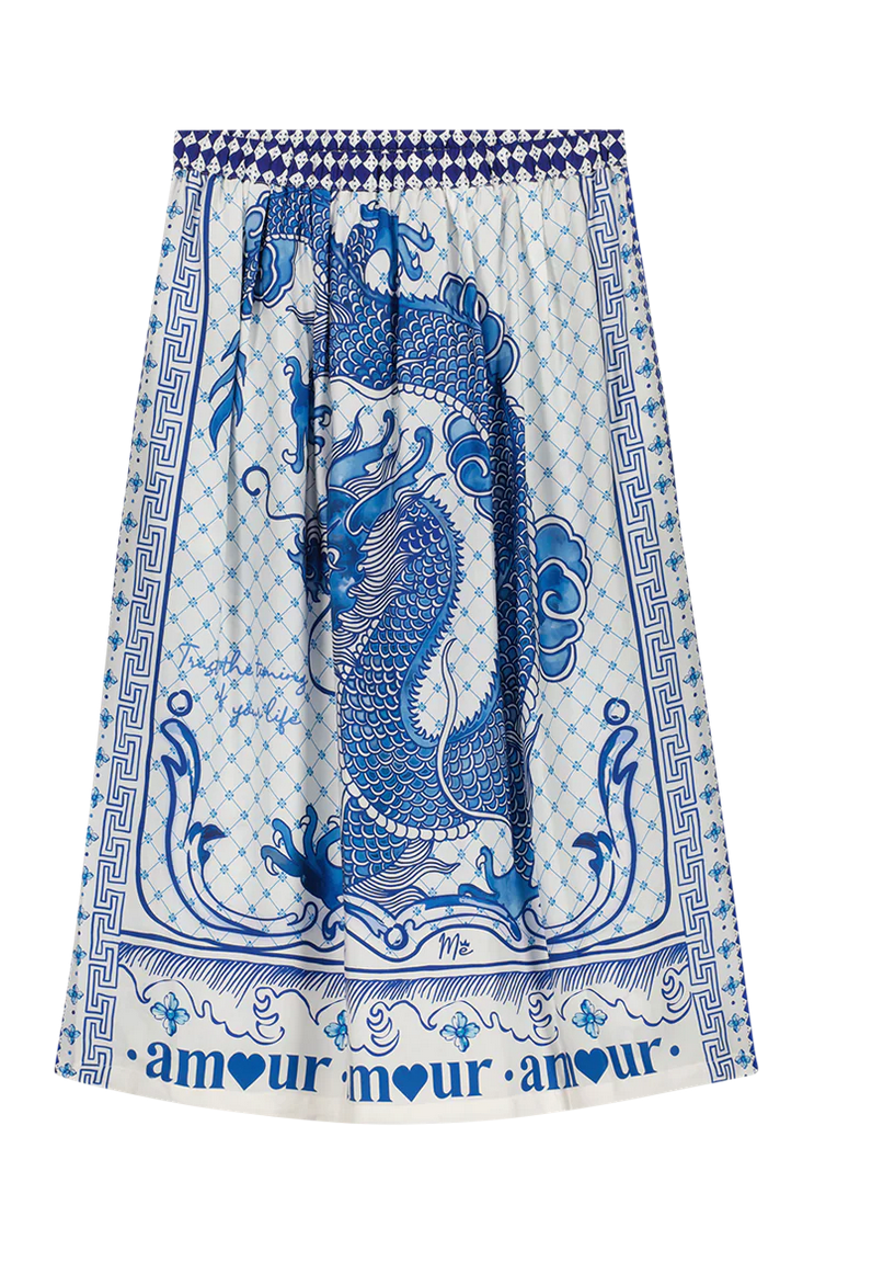 Beautiful pleated blue and lavender midi skirt with an elastic waistline and side pockets.The skirt features a large fanciful dragon on the front with a diamond check background. The hemline reads “amour amour amour” with hearts in place of the o’s.