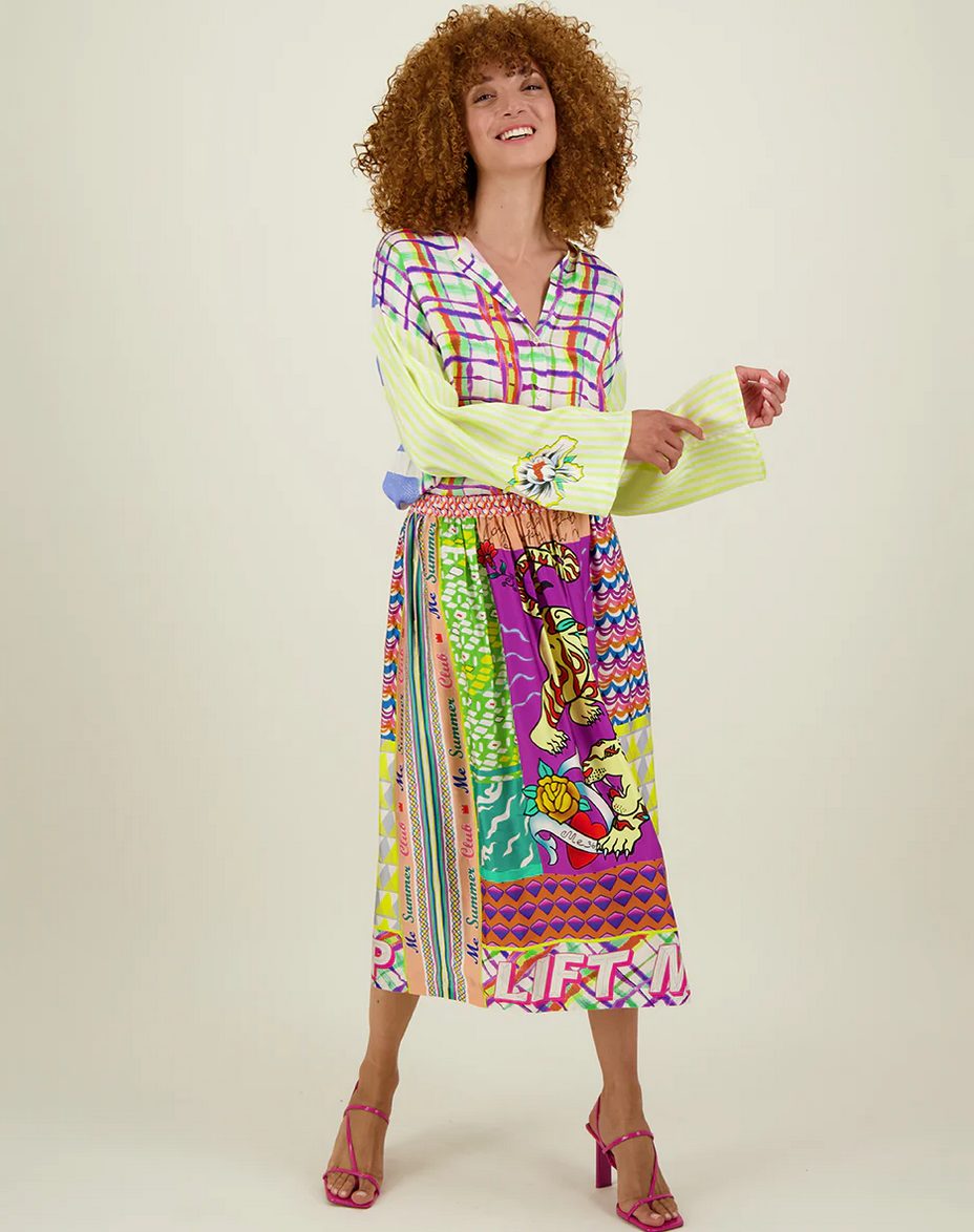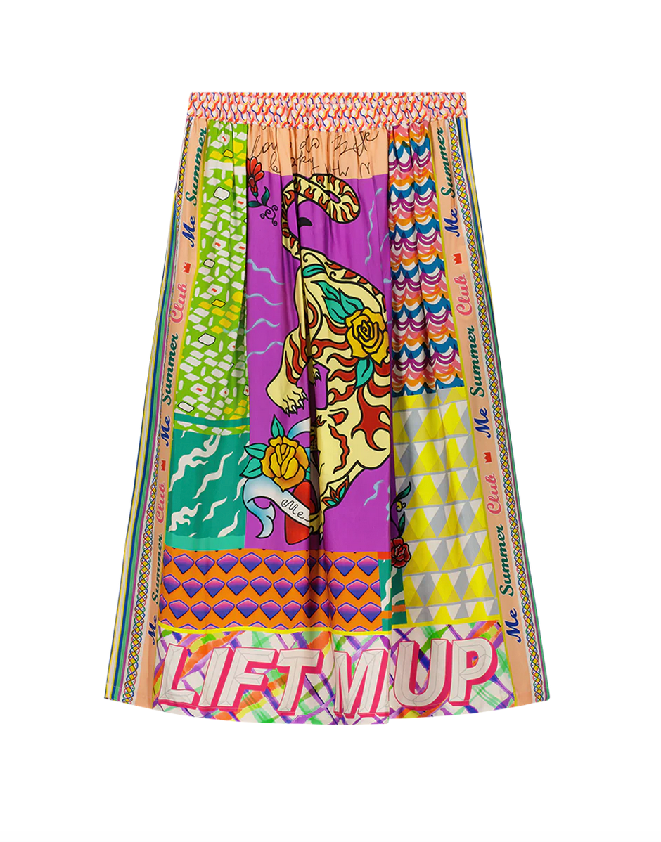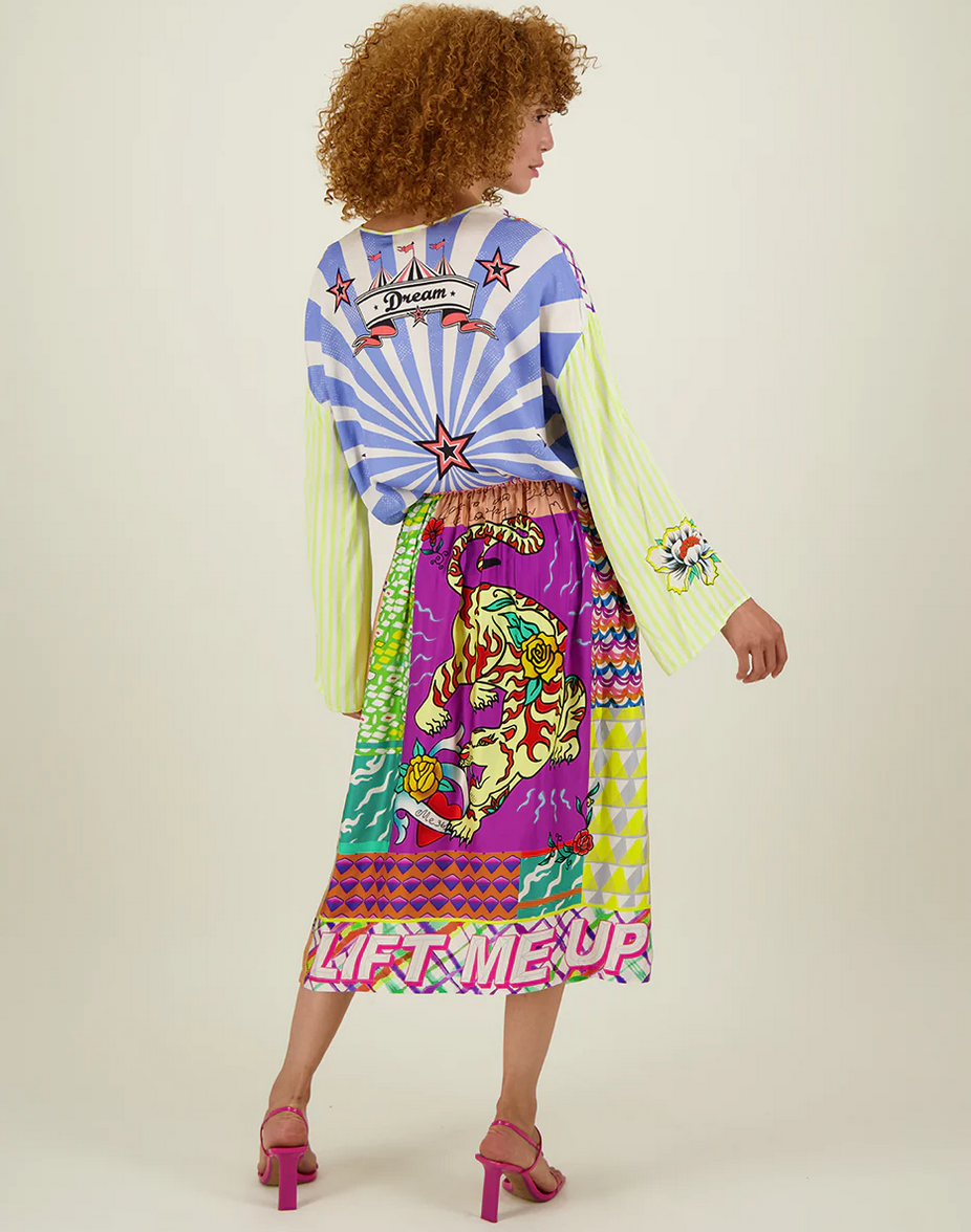 Beautiful pleated colorful midi skirt with an elastic waistline and side pockets. Skirt features a fabulous graphic tiger on a mixed geographic print background. Skirt reads “LIFT ME UP” along the bottom. Pair this with our matching top for a boho chic elegant look.