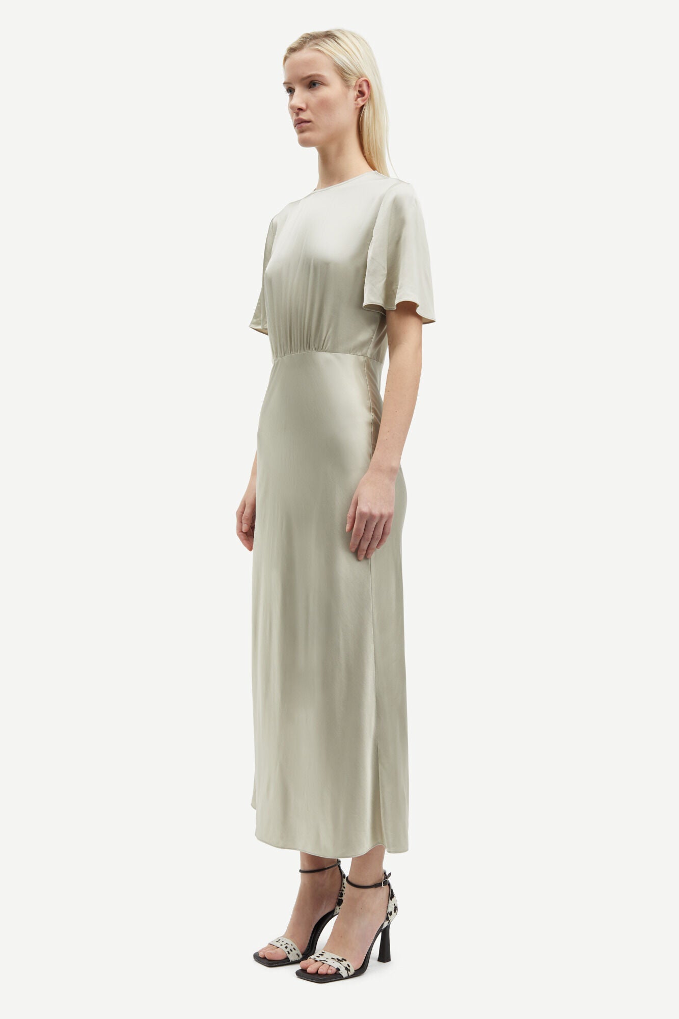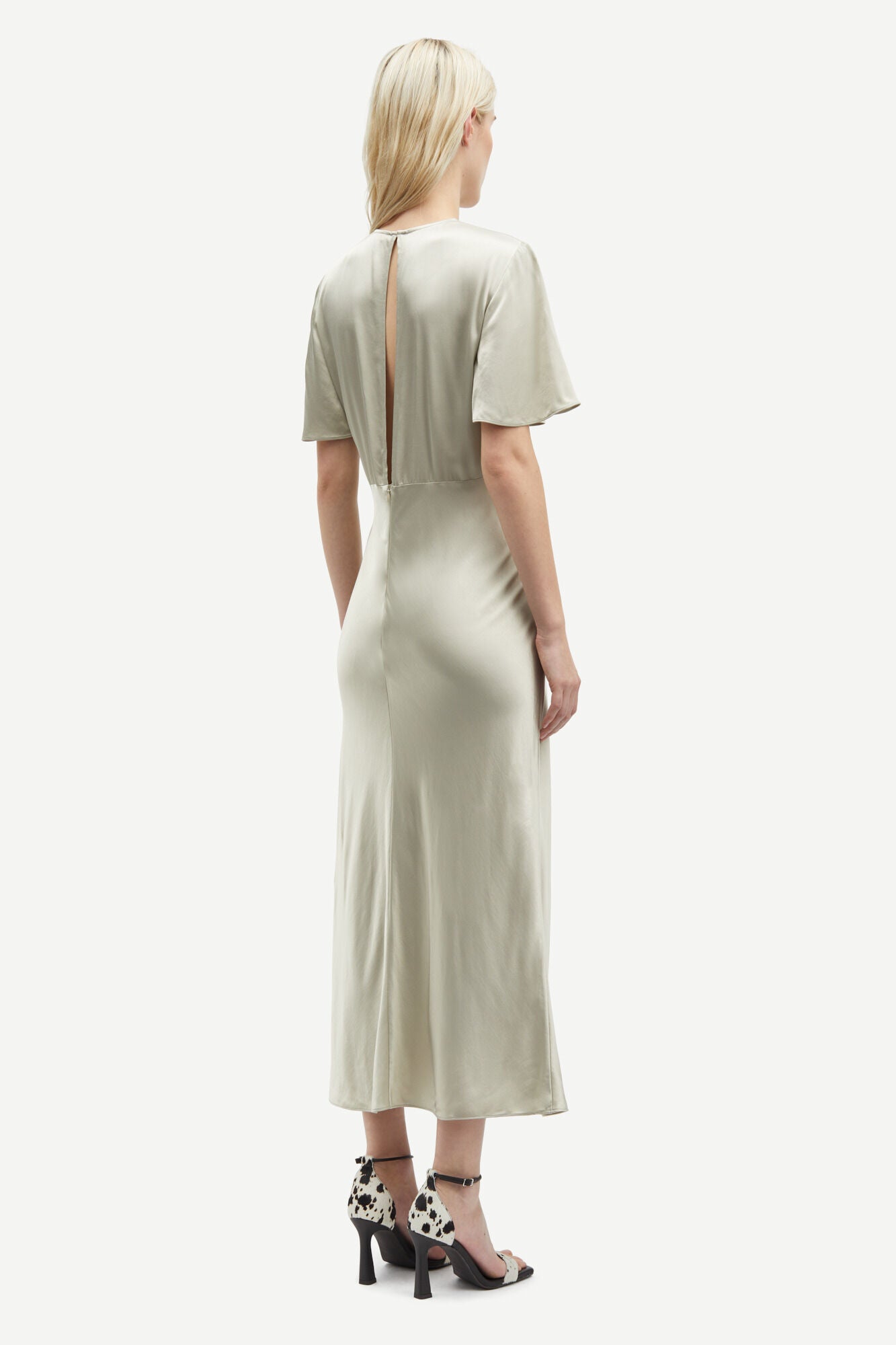 Short-sleeved satin maxi dress with a regular fit and fitted waist. Button and loop as well as invisible zipper closure on the back. Round neck and slit at the back. Main material made from a blend with LENZING™ ECOVERO™ Viscose. This product contains LENZING™ ECOVERO™ Viscose, certified with the EU Ecolabel for textile products (licence no. AT/016/001) for environmental excellence.