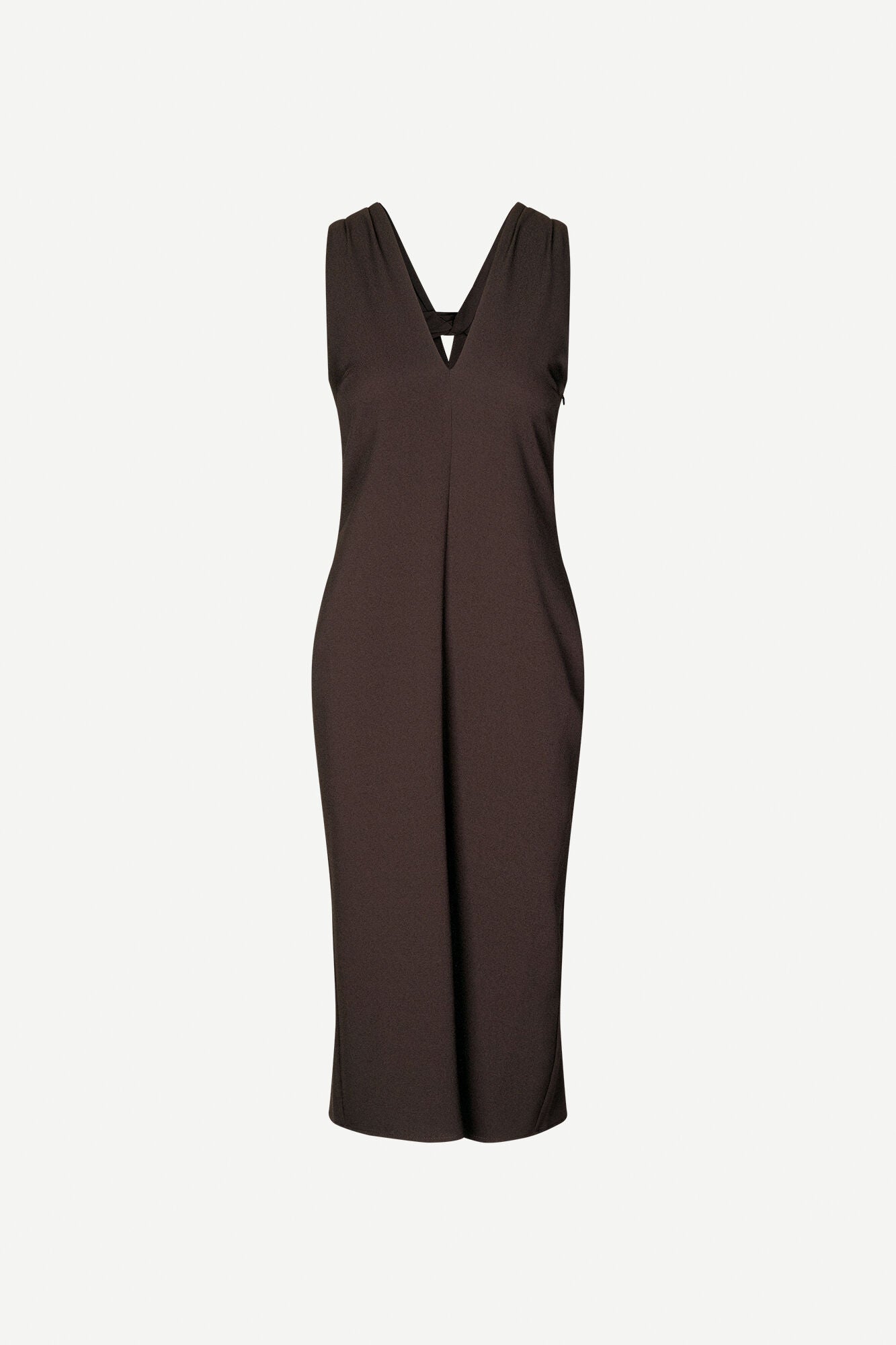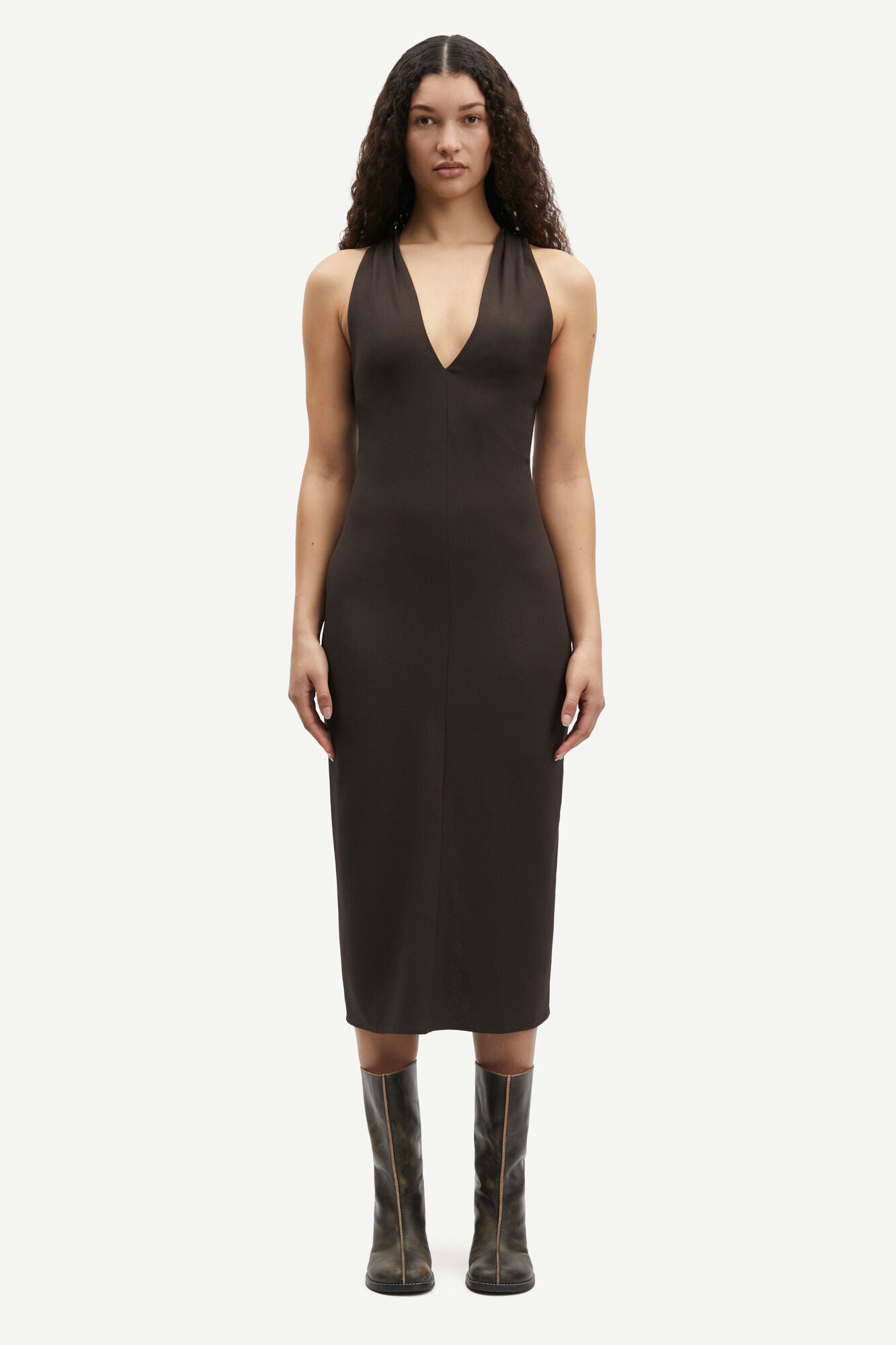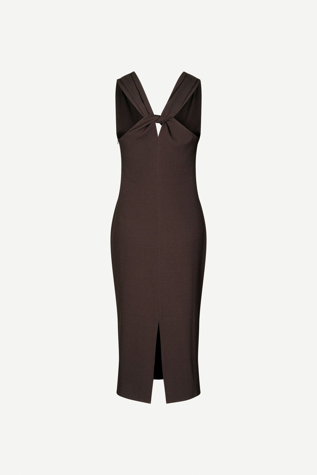 Sleeveless midi dress with a regular fit. Invisible zipper closure on the side. Slit at the back. V-neck. Twisted straps at the back. Main material made from an elastic recycled polyester-blend. This product contains recycled polyester derived from pre- and post-consumer waste.