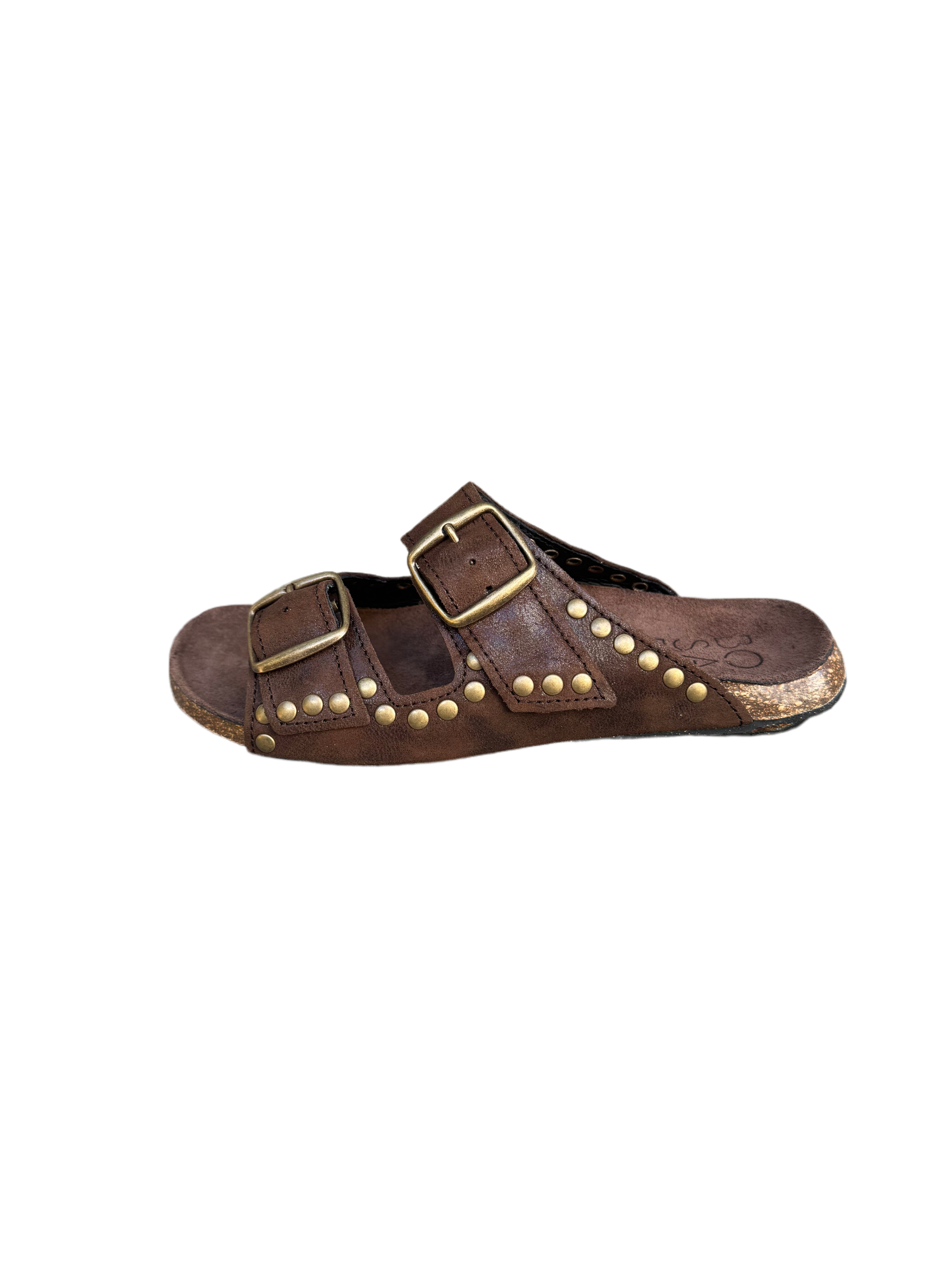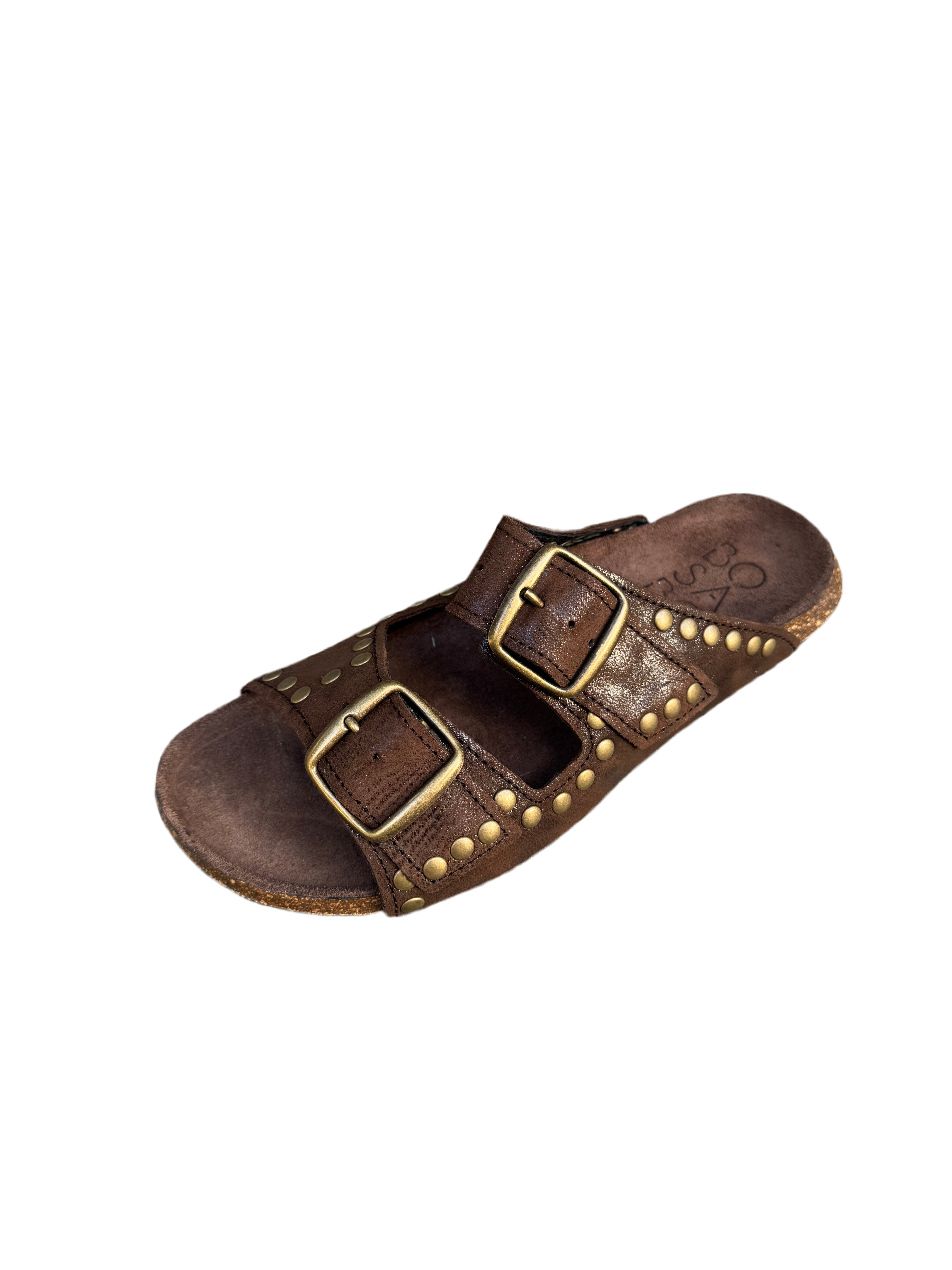 Handmade buckled slides with fine moulded cork footbed (lined with suede).