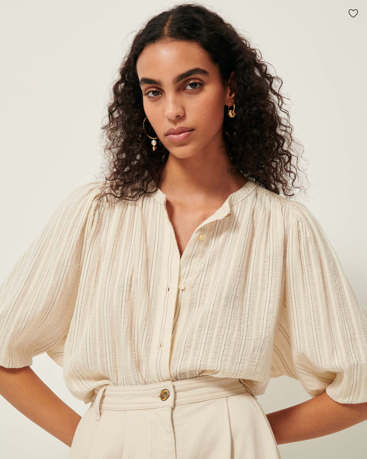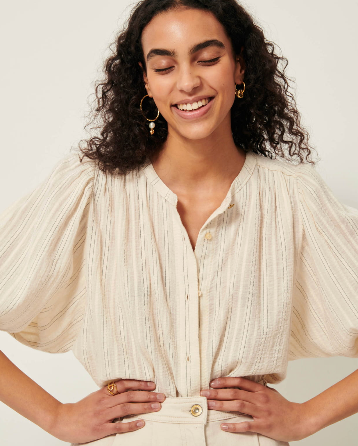 Blouse with ¾-length balloon sleeves in a cotton gauze crepon fabric featuring a textured weave and fine contrasting stripes.