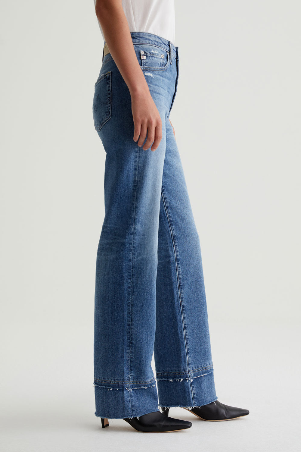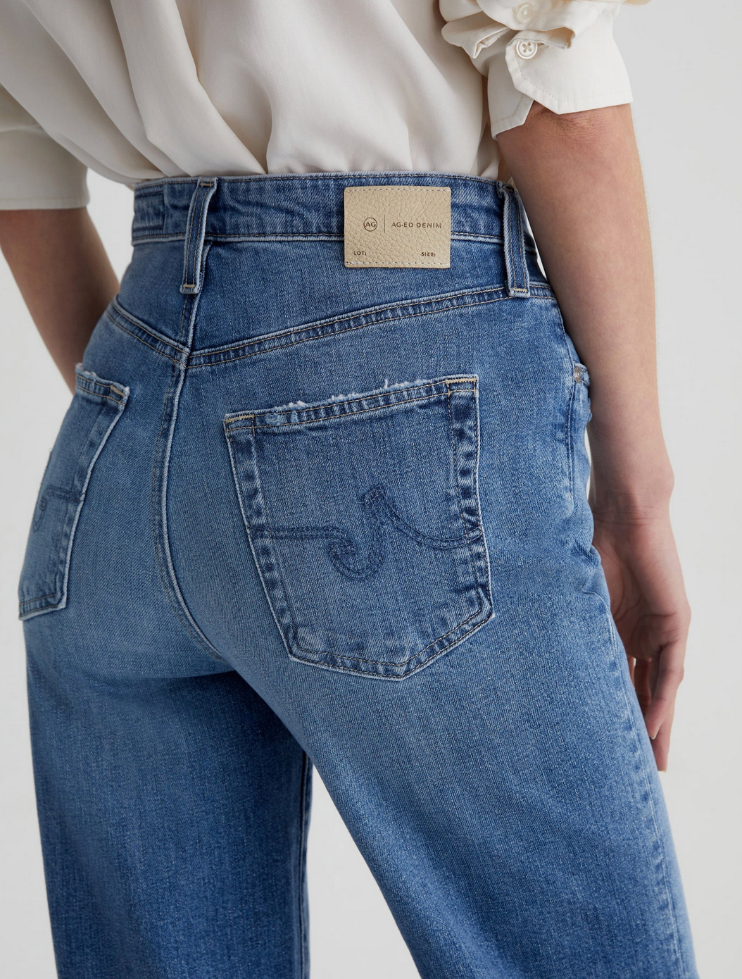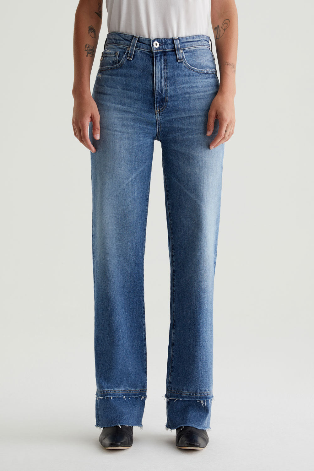 The Kora wide-leg jeans have an ultra-high waist and a loose, easy fit that's updated with double raw hems. Designed in 11.75 oz. Vintage Comfort Stretch Denim from Italy, this pair features a medium blue AG-ed™ wash. It's custom-developed with faded details and distressing at the pockets for a naturally worn appearance.