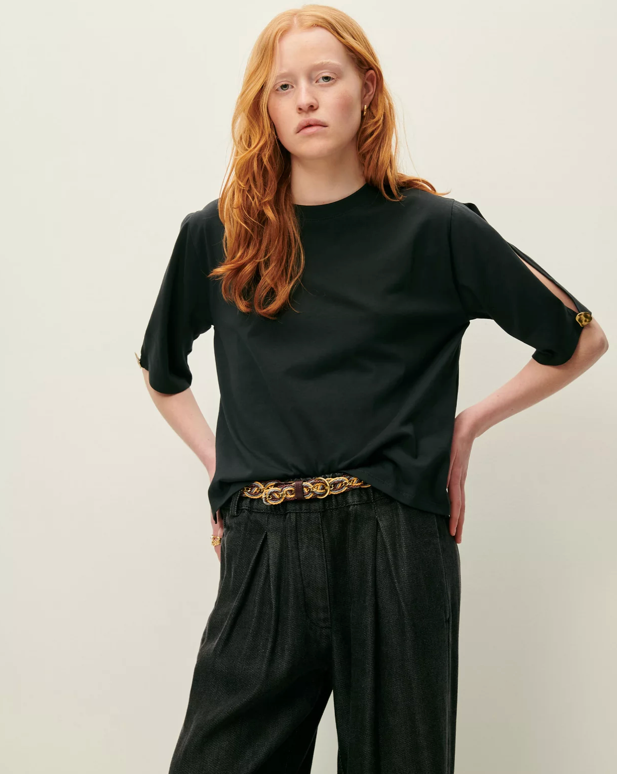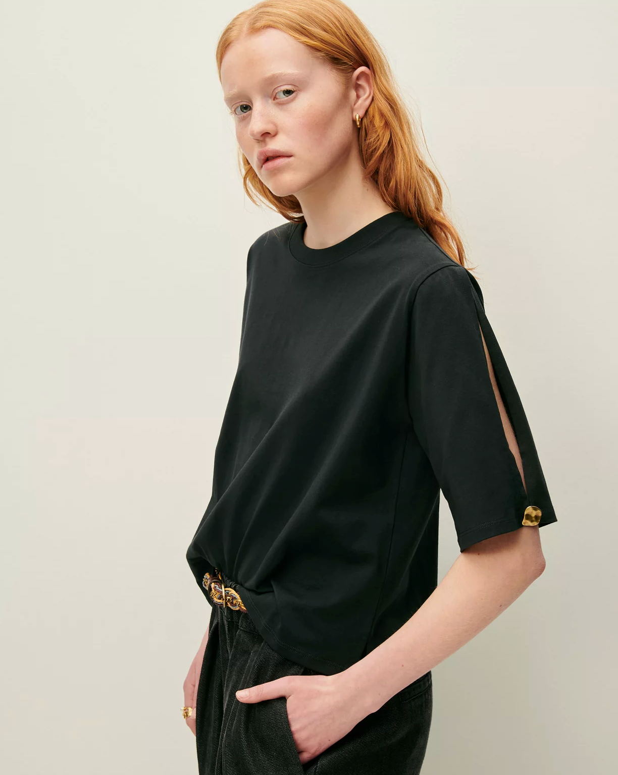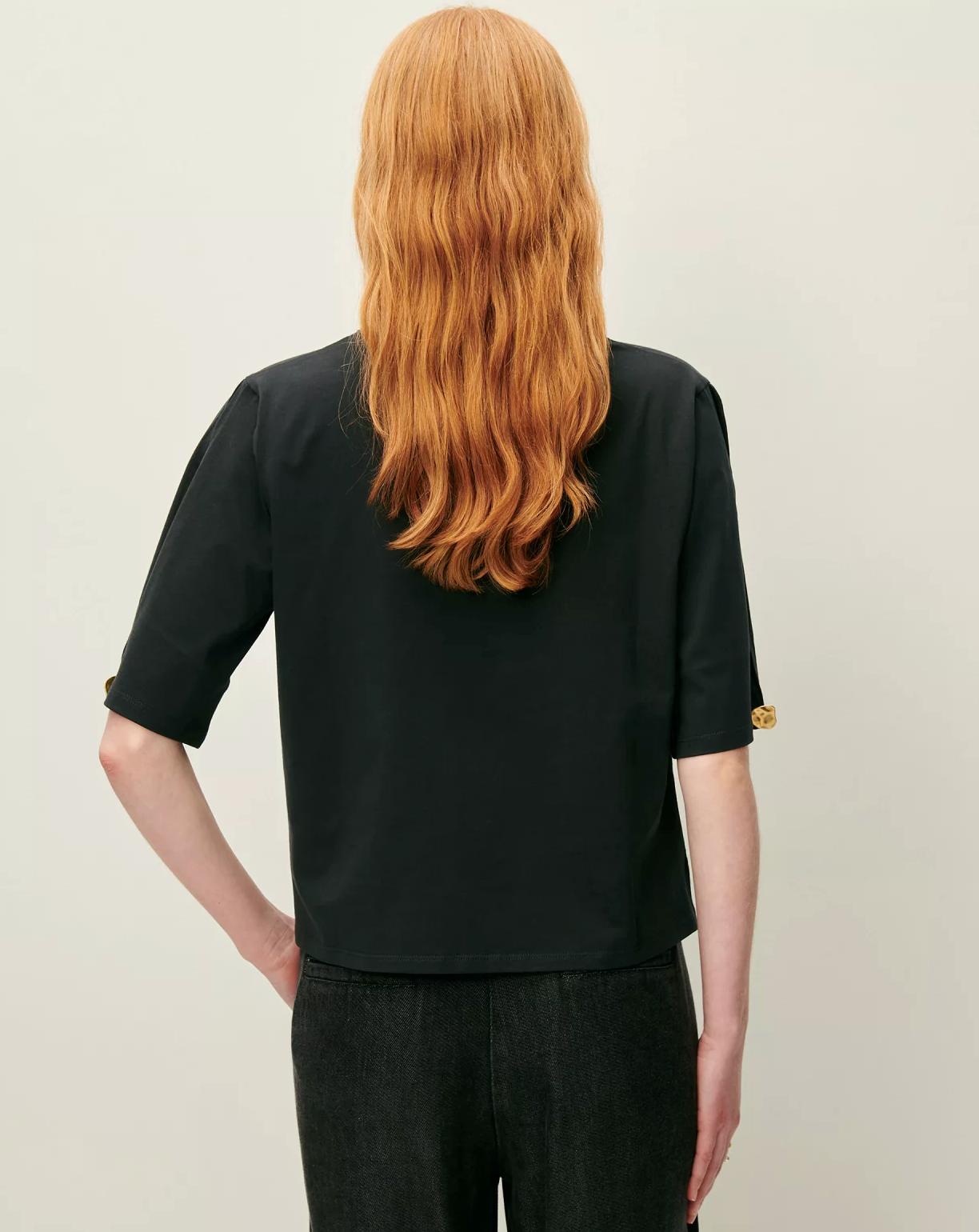 Short sleeves with a slit opening fastened by a jewel button fastening.