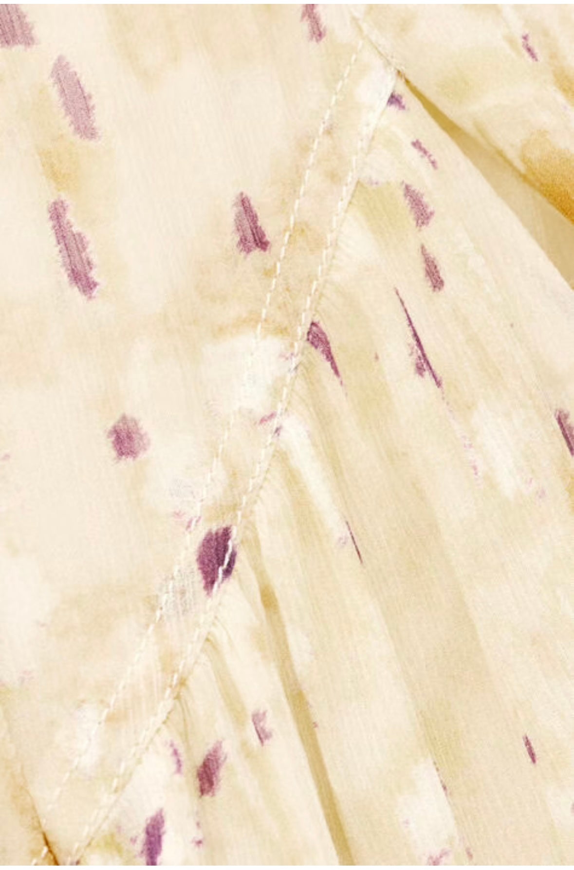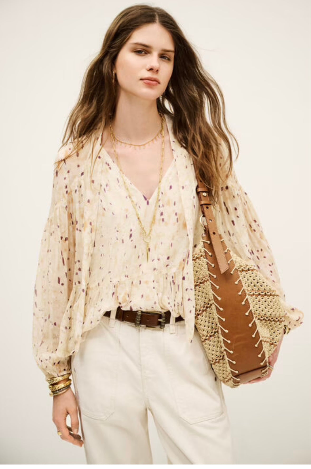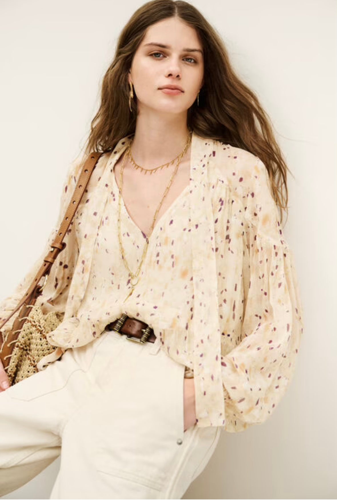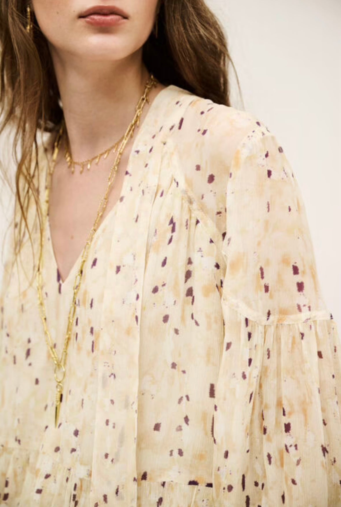 Enjoy a relaxed fit with this printed voile blouse featuring a playful ruffled hem and soft lining. The puffed sleeves end in comfy elastic cuffs, while the lavalliere neck adds a flirty touch when left loose. Finished with eye-catching contrasting topstitching, this beige blouse brings charm to any outfit.