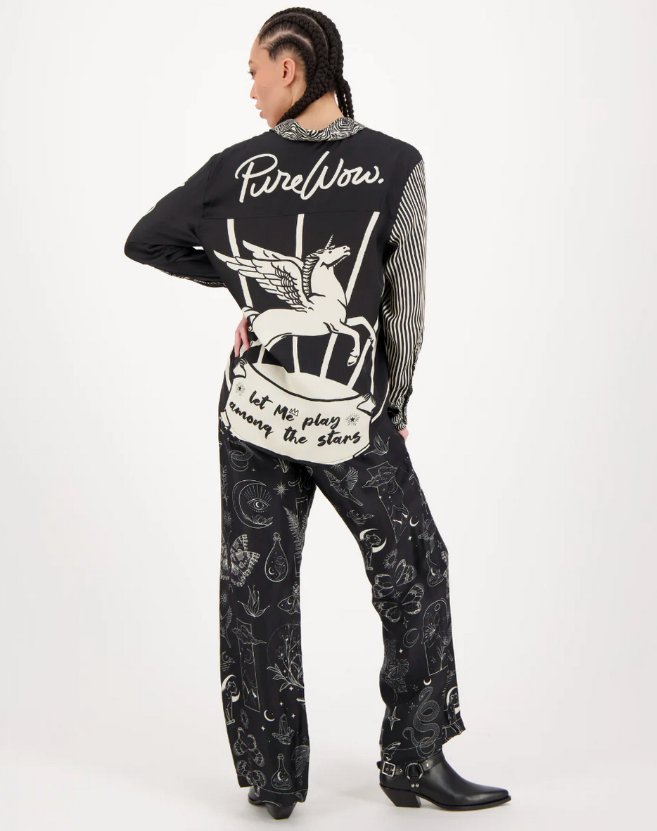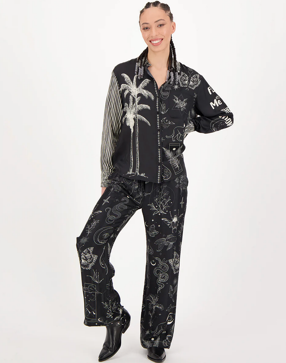 Elastic waist straight leg pants in our Black Magic print. Two side pockets, two back pockets. Pants are black with white graphics featuring butterflies, panthers, snakes and moons.