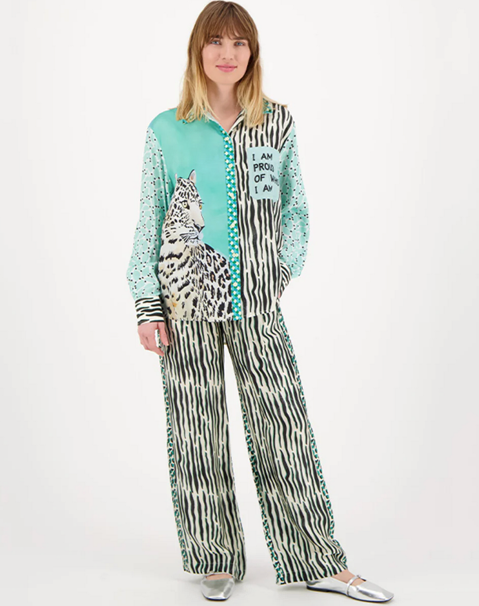 pockets. Front of the pants are zebra striped. Back and waistband are turquoise, green and black geometrics. Back pocket reads “LA LA LOVE YOU”. T