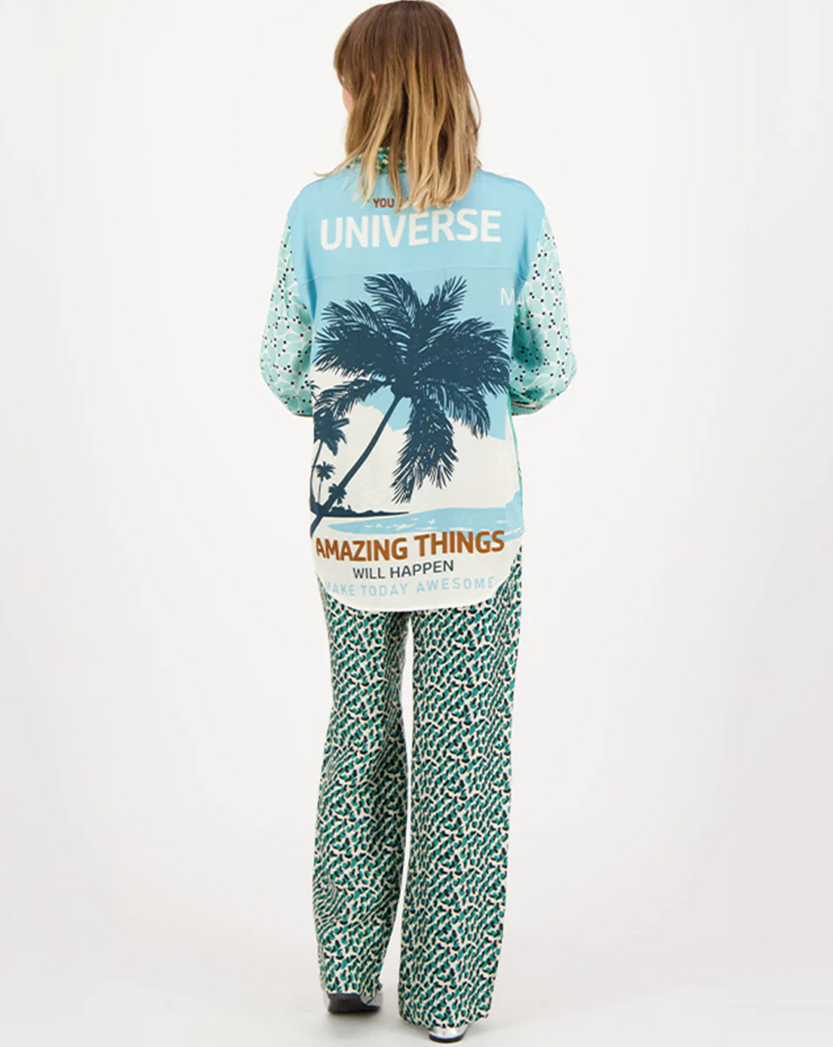 Elastic waist straight leg pants in our Tropical Safari print. Two side pockets, two back