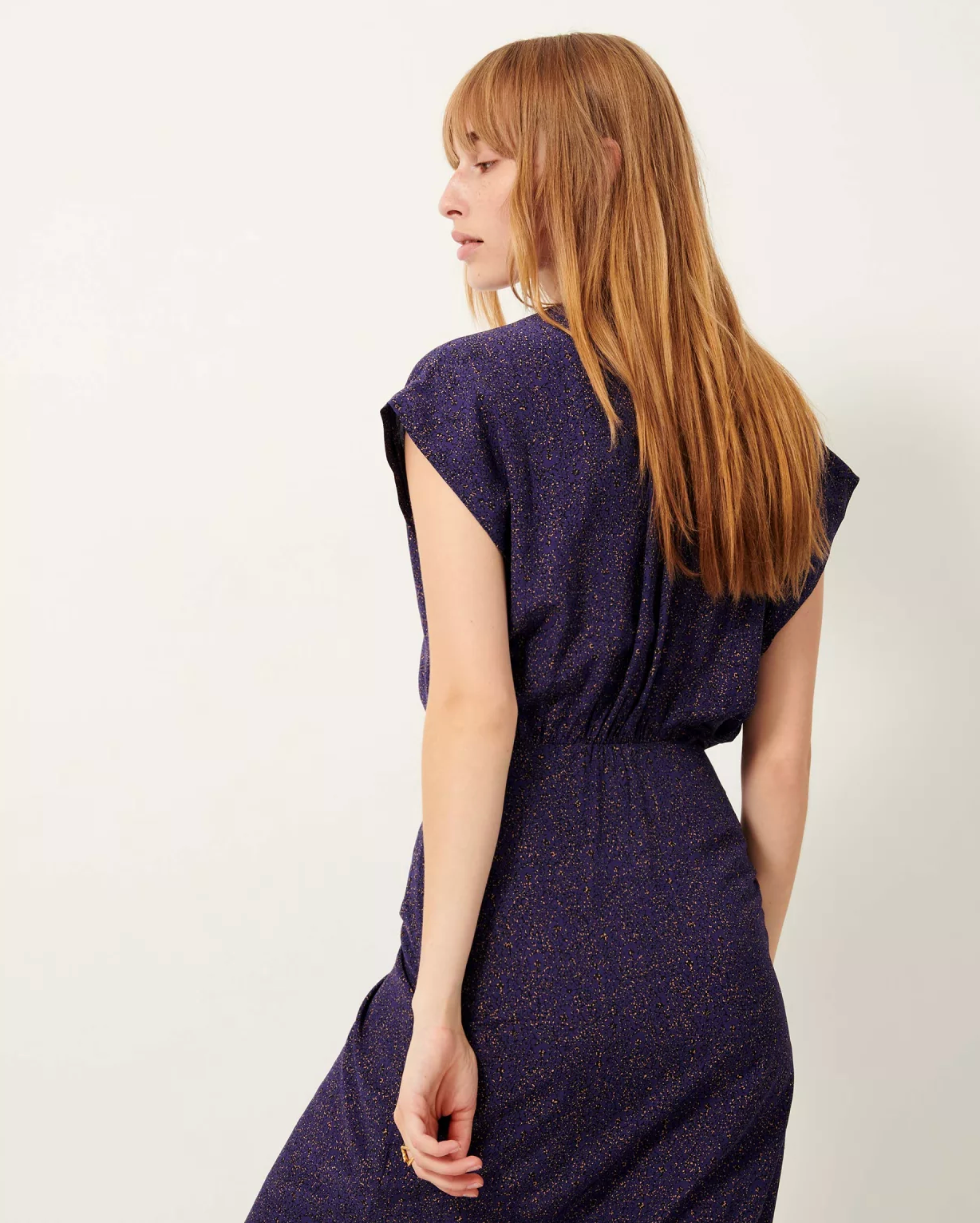 Sleeveless midi dress with front gathering in an airy, fluid viscose print fabric, exclusive Sessùn pattern.