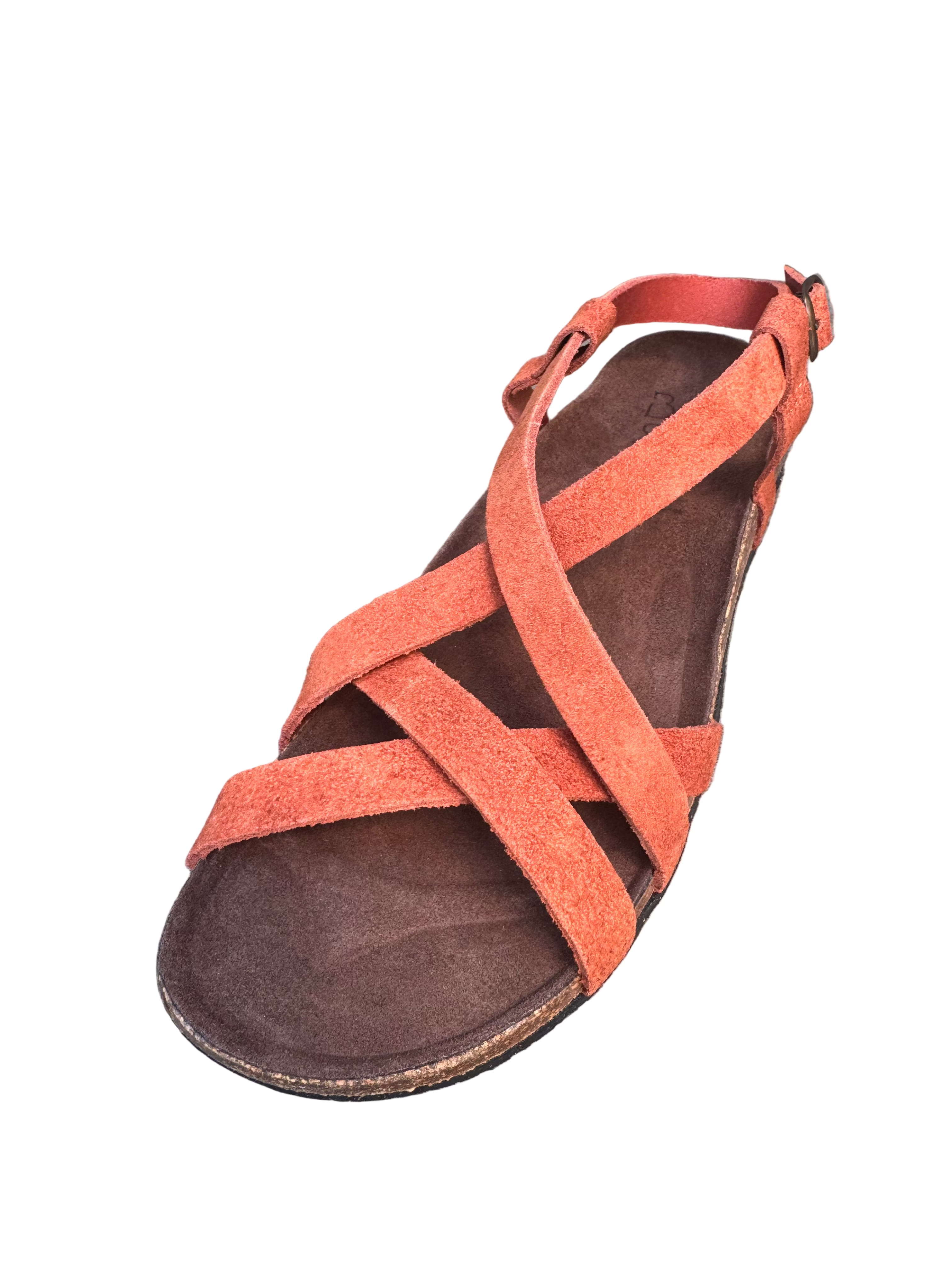 Cross-over sling back sandals with moulded cork footbed. Upper in a rust coloured suede & bronze buckle.