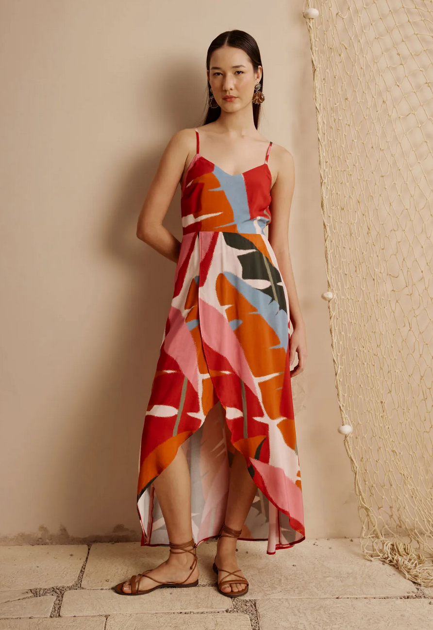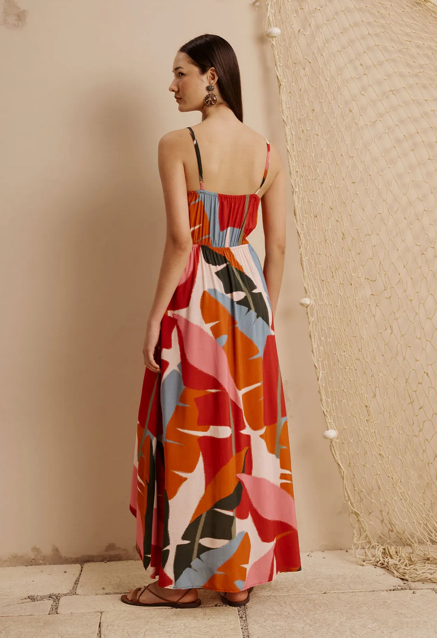 The Igapo Printed Mullet Maxi Dress from CaCay is the perfect choice for those seeking lightness, movement, and sophistication in a single piece. With a flowing design and impeccable drape, it flatters the silhouette with its mullet cut and thin straps, offering comfort and freshness thanks to its 100% viscose composition