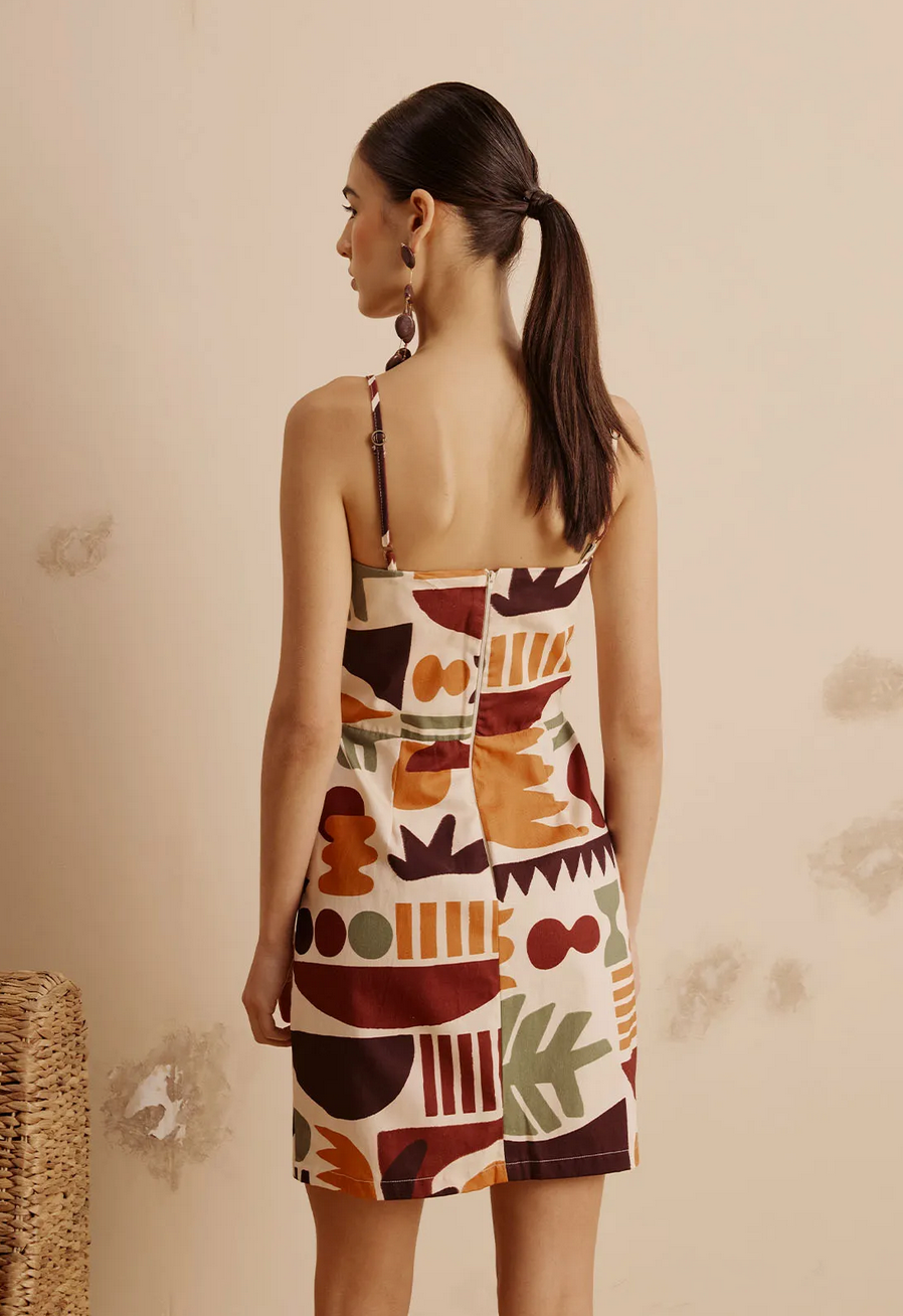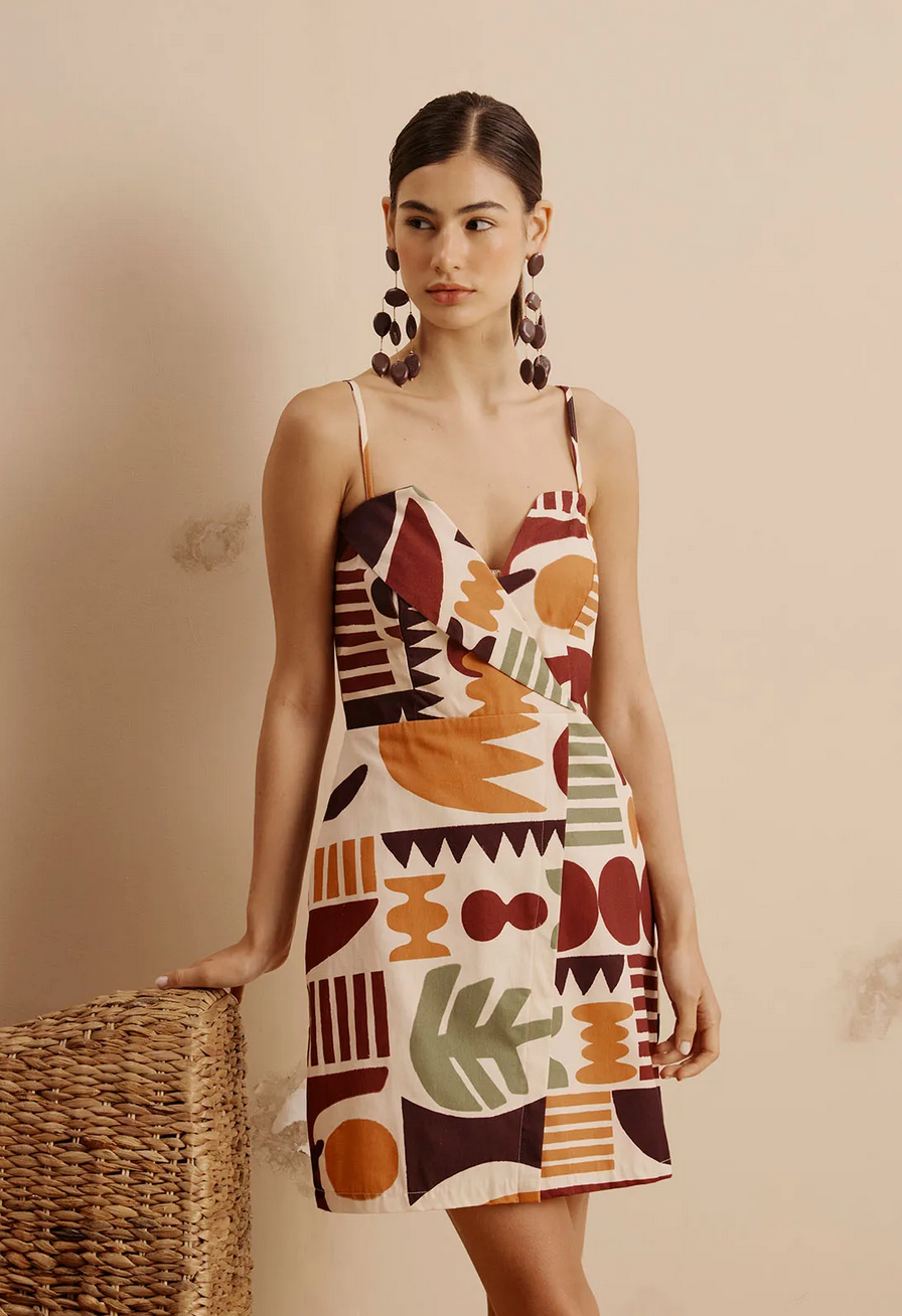 The CaCay Short Dress with a Turned-Up Neckline and Ribeirinha Print Made from 100% cotton , it offers a soft touch and ideal breathability for everyday wear. Its design combines a turned-up neckline with adjustable thin straps and an exclusive print inspired by natural elements and geometric shapes