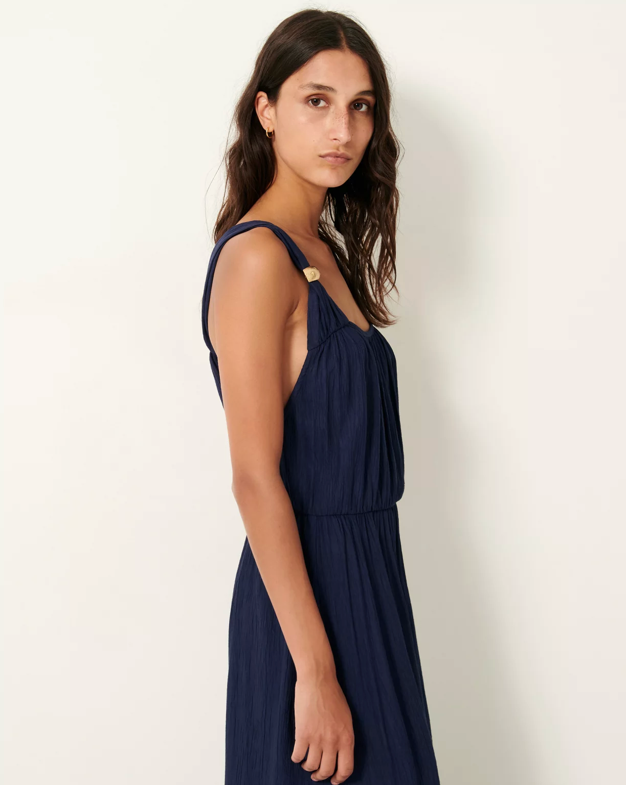 Long dress with an elasticated waist, straps crossed at the back in soft certified viscose crepon.