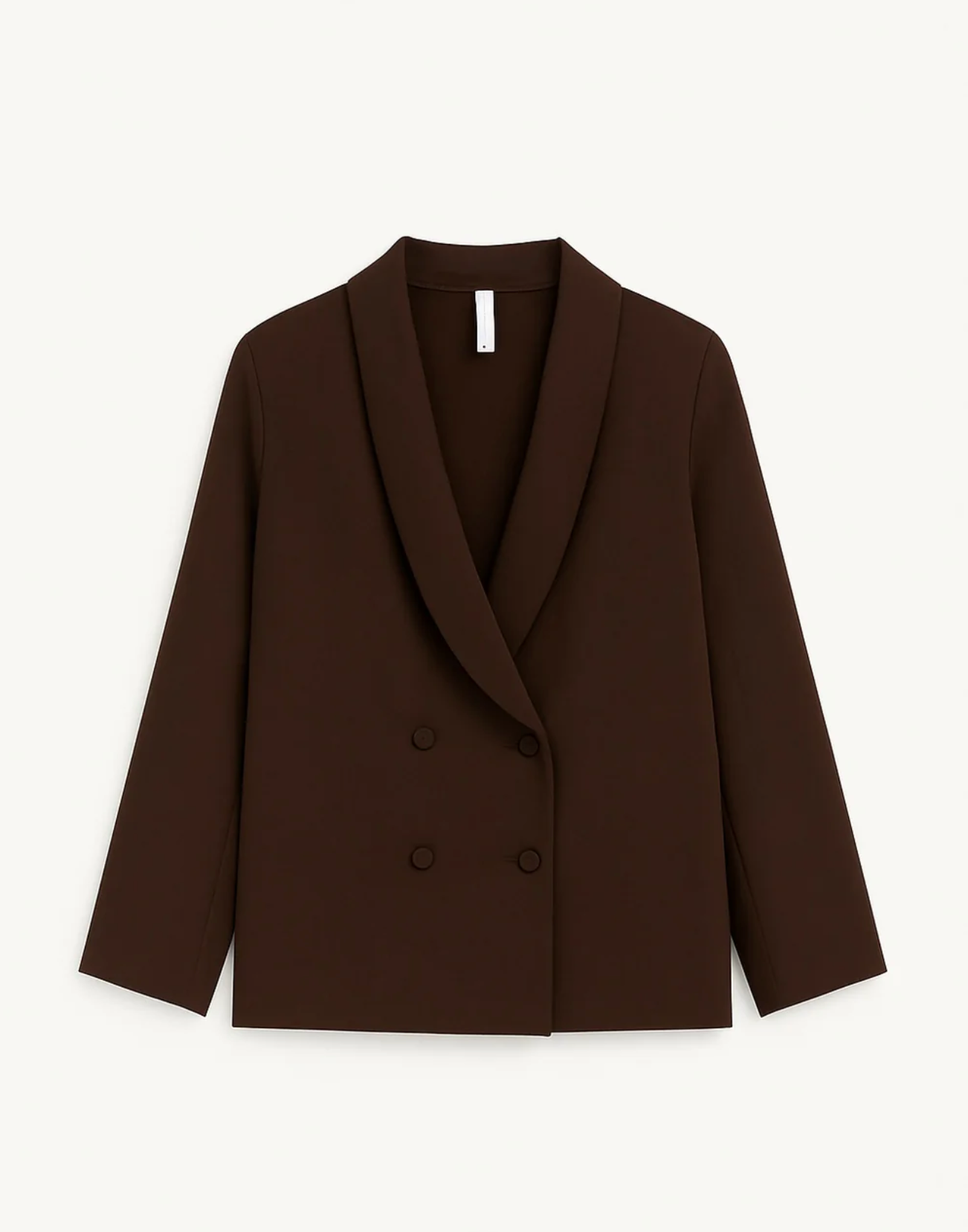 A fluid blazer designed for those seeking effortless elegance. Its loose fit and relaxed construction, with no shoulder pads or lining, create a natural contemporary drape. the shawl collar and double-breasted fastening with covered buttons lend it a chick look.