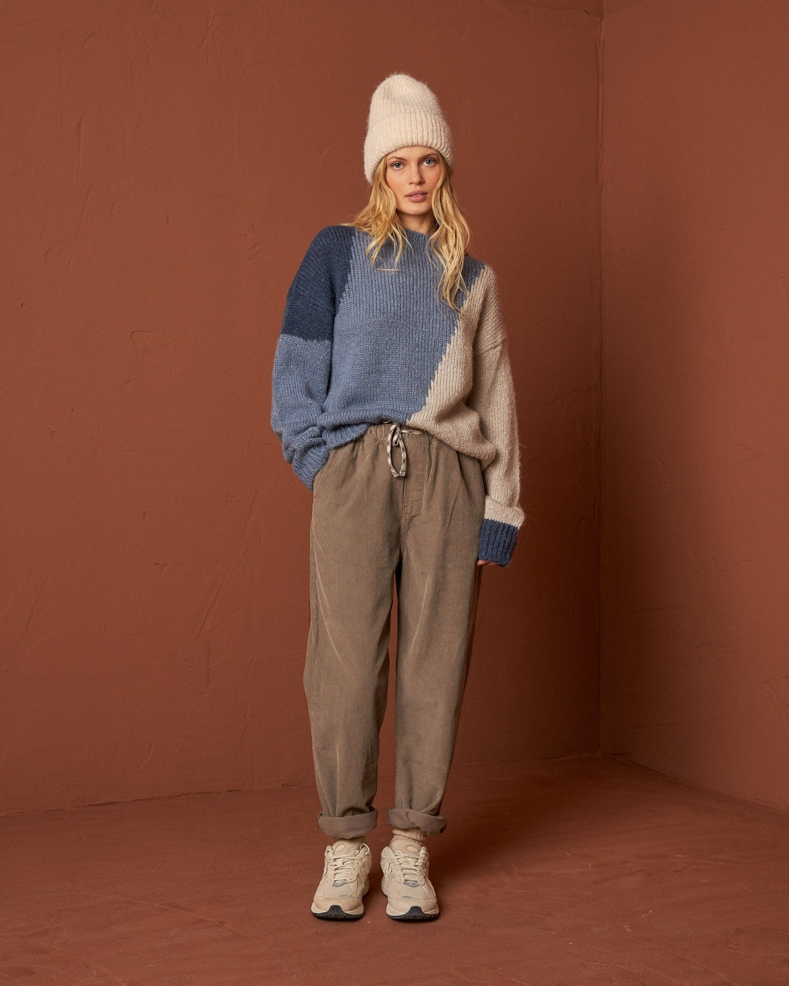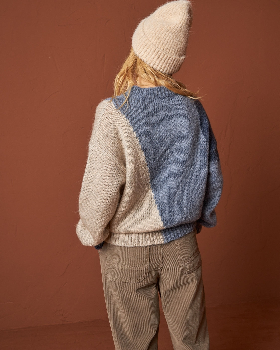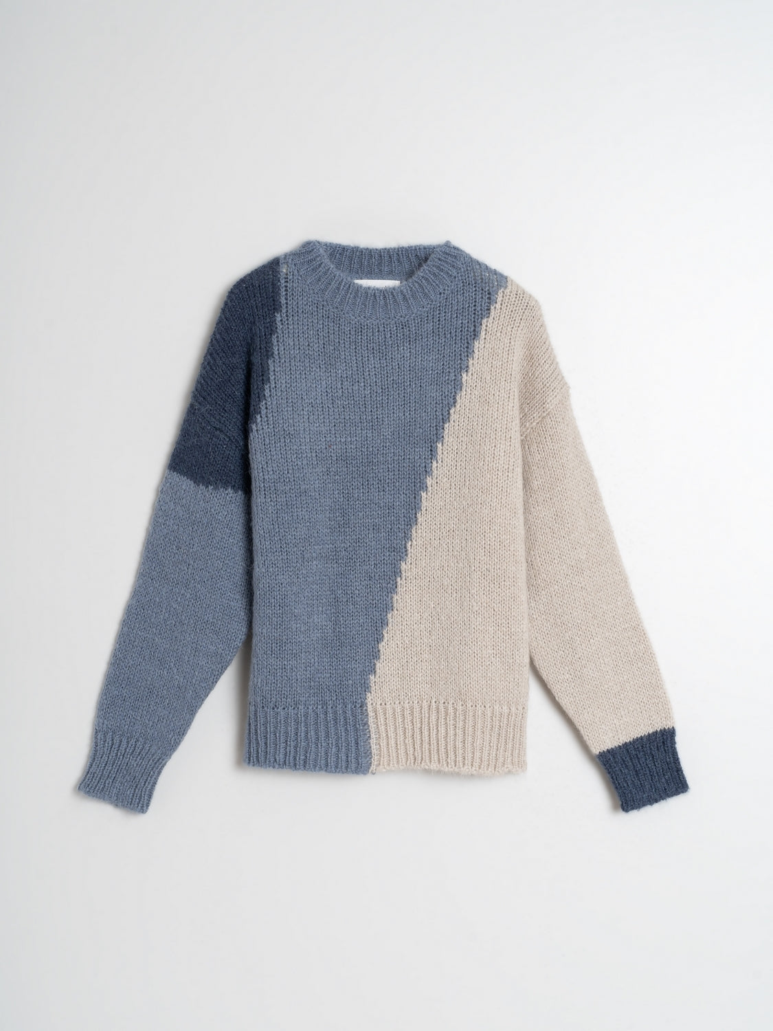 - Knitted fabric made in plain stitch with tricolor intarsia that gives it a colour gradient appearance