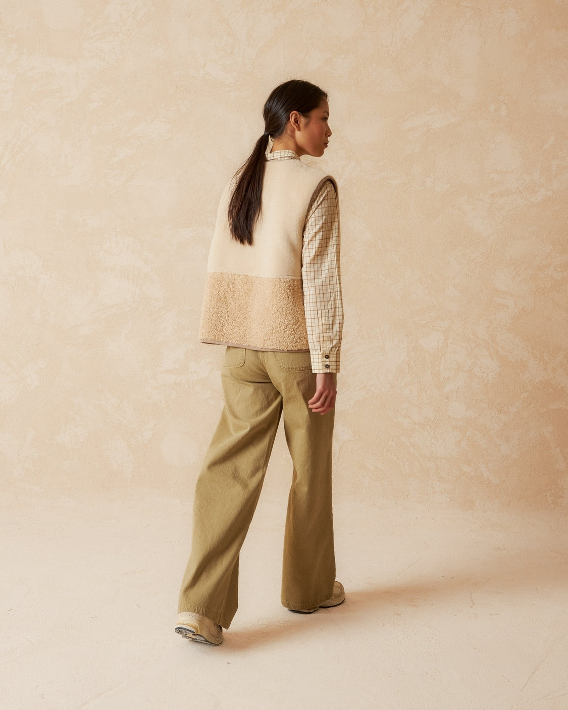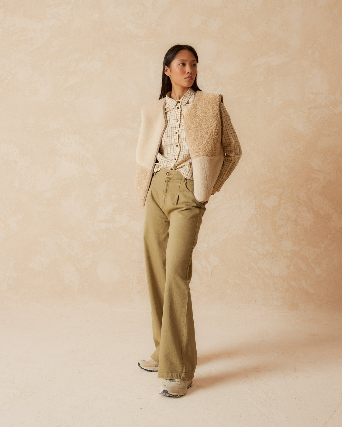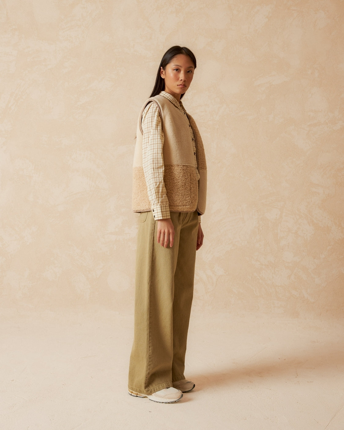 - Reversible garment, on one side a two-tone teddy effect with patchwork and on the other side a nubuck effect