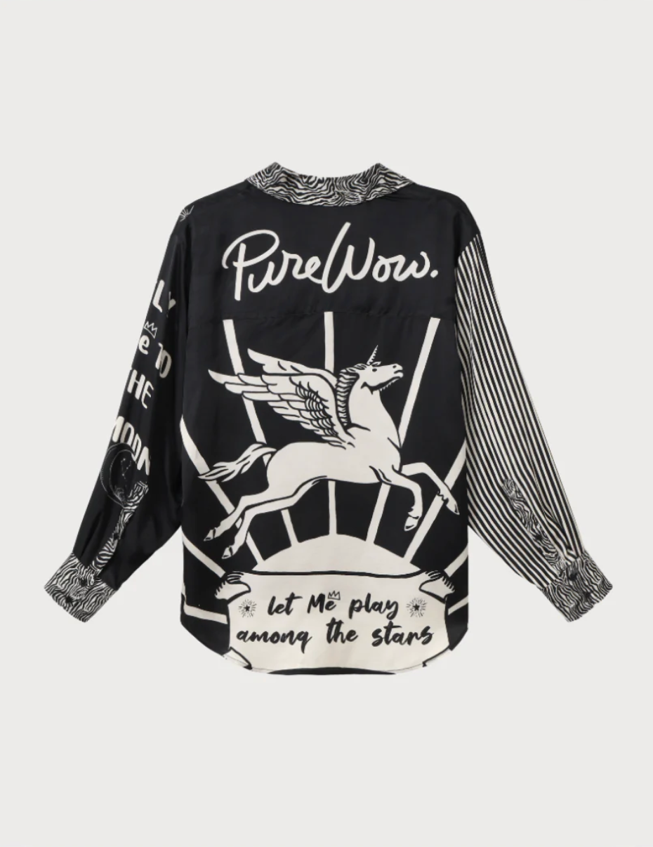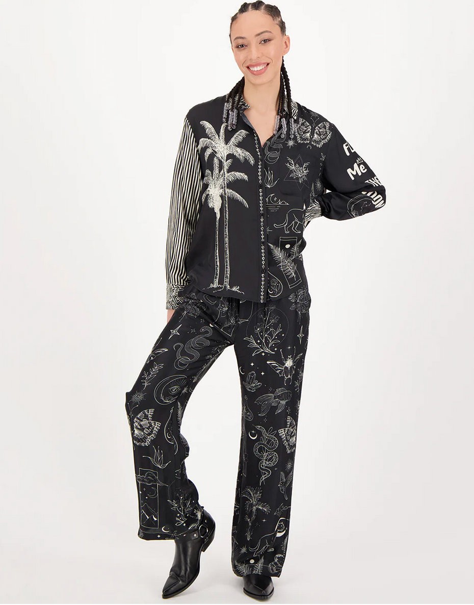 Black, long sleeve shirt with collar and cuffs in our Black Magic print. Six button front closure. Print is in white. Collar and cuffs are zebra striped. Front of the shirt has two palm trees on one side and lots of graphics on the other such as a leopard, moons, snakes and butterflies. One sleeve is striped, the other reads “FLY Me to THE MOON”. Back reads “Pure Wow. “ at the top and features a large unicorn. Reads: “Let Me Play Among the Stars “ at the bottom. Pair with our matching Bailey track pants for a slick, elegant look.